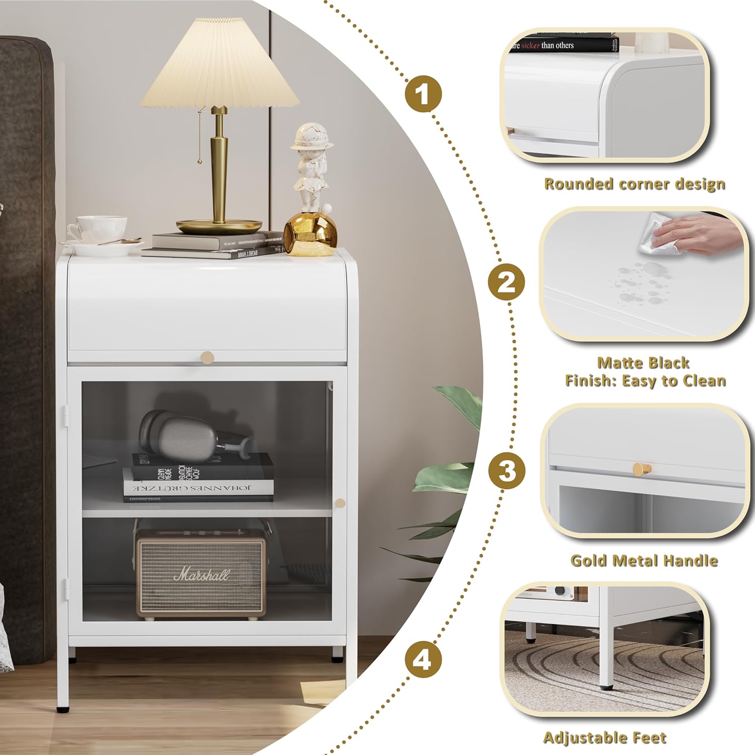 - Sturdy and Stable: Built from high-quality cold-rolled steel, also waterproof surface treatment is easy to clean and maintainour nightstand set offers superior strength and durability compared to wood or fabric options. Designed to last, it provides a reliable addition to your bedroom furniture, . We provide 4 adjustable feet for you to adjust on uneven floors. The plastic feet also prevent the metal legs from directly touching the floor, Avoid tiles, Scratches on wooden floors