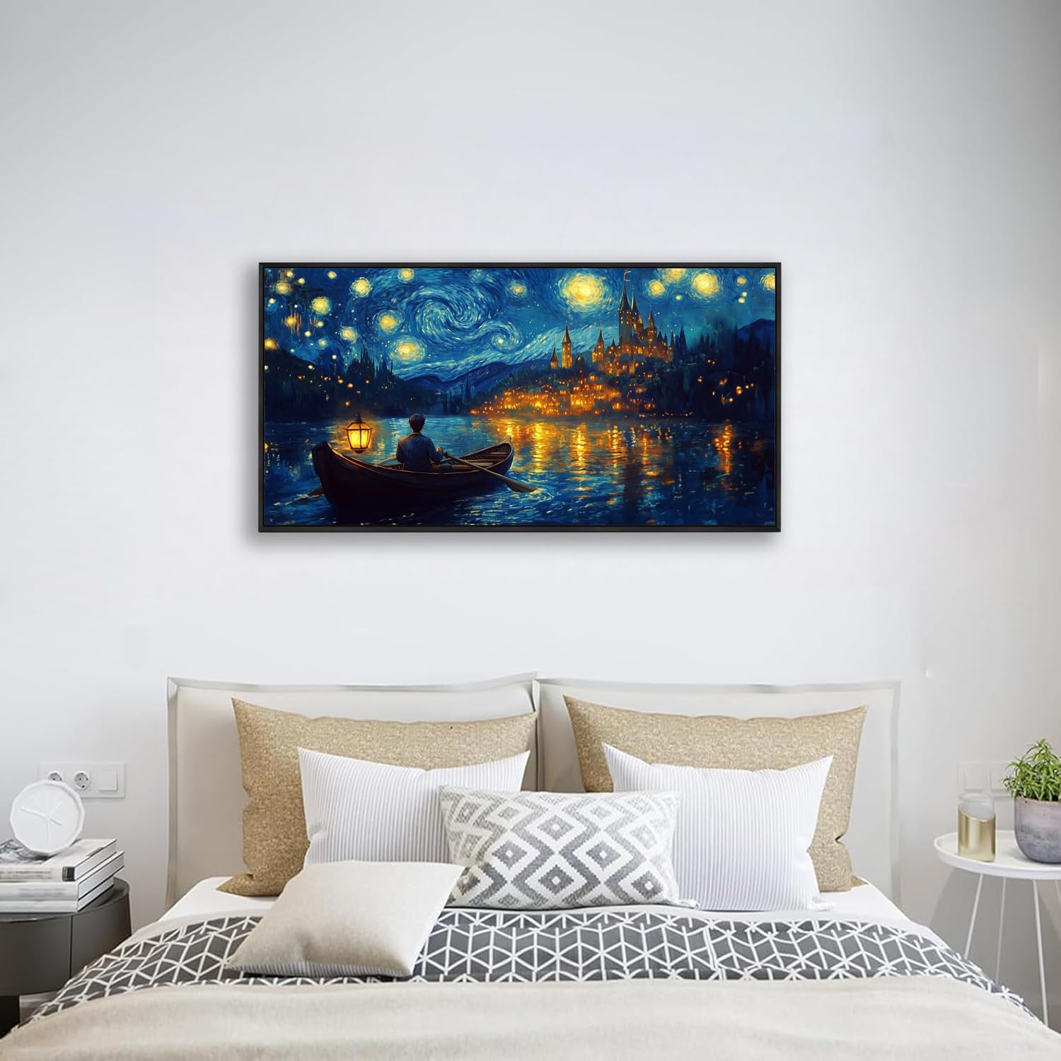 Wall Art Canvas Print Starry Night Over the Rhone by Van Gogh 20 x 40 inches Framed Home Artwork Decor Canvas Art Painting Living Room for Bedroom Office Wall Decor