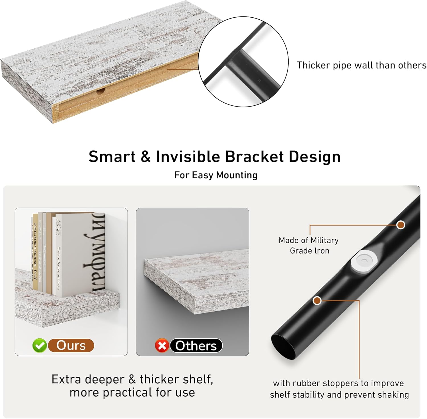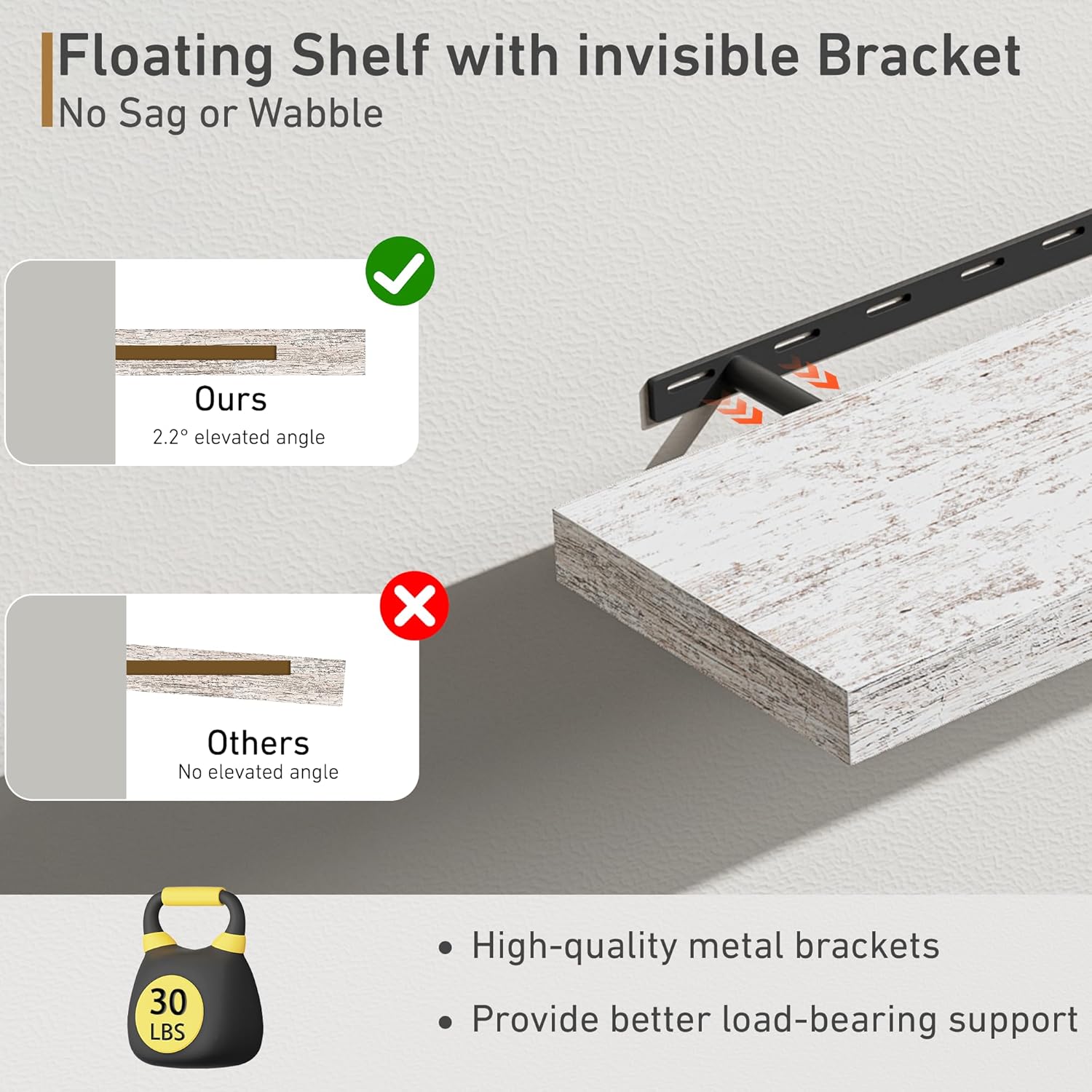 - Rustic & Modern Wooden Floating Shelves - Our shelf is made of durable engineered wood with a natural wood grain finish for a rustic feel. Matte surface makes it modern and minimalist look. It can be mounted and decorated on every wall of your home, perfect for various scenes, whether display your collection or storage.