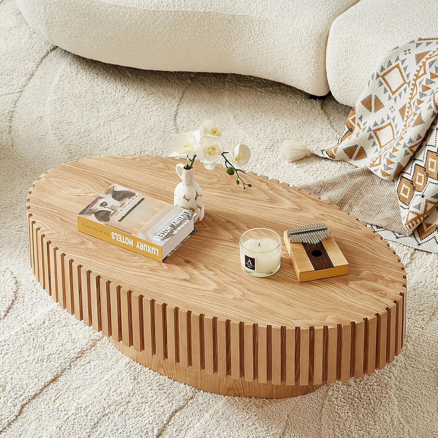 Oval Coffee Table for Living Room, Modern Fluted Coffee Tables with Pedestal Base, Handcrafted Centre Tea Tables Easy Assembly-43.7" Natural