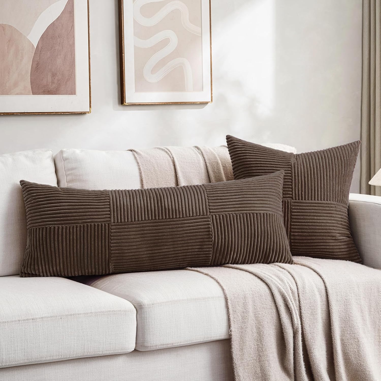 Fancy Homi Set of 2 Dark Brown Boho Long Lumbar Body Decorative Throw Pillow Cover 14x36 Inch for Bed Couch Bedroom Bench, Soft Patchwork Corduroy Textured Pillow Case, Rustic Farmhouse Room Décor