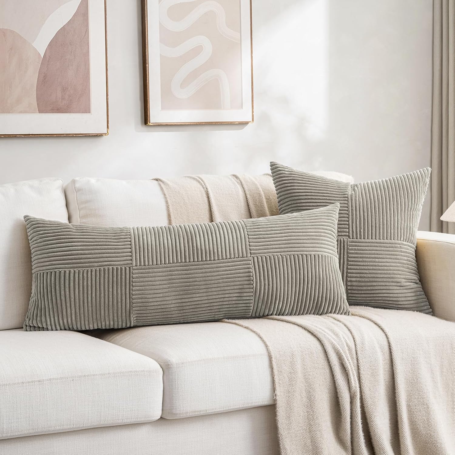 Fancy Homi Set of 2 Neutral Grey Boho Long Lumbar Body Decorative Throw Pillow Cover 14x36 Inch for Bed Couch Bedroom Bench, Soft Patchwork Corduroy Textured Pillow Case, Rustic Farmhouse Room Décor