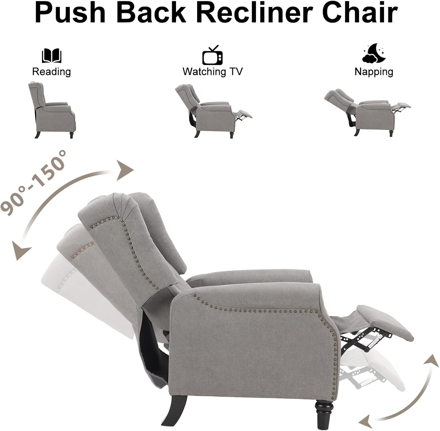 EBELLO Pushback Recliner Chair, Fabric Armchair Push Back Recliner with Rivet Decoration, Mid Century Wingback Accent Chair for Living Room, Bedroom, Grey