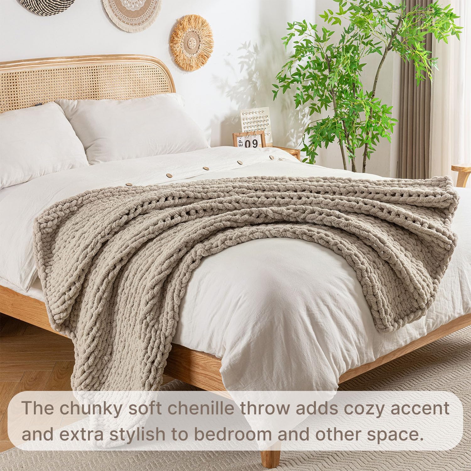Chunky Knit Blanket Throw, 100% Hand Knit Throw Blanket Handmade Chenille Cable Knit Throw for Couch, Stylish Cozy Soft Rope Knot Crochet Blanket for Home Decor, Beige Linen, 50x60 Inches