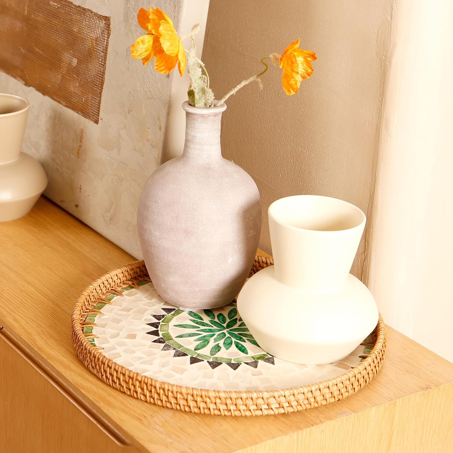 Round Rattan Tray with Mother of Pearl Inlay & Wooden Base - Decorative Wicker Serving Tray for Coffee/Bread/Fruits, Food Storage & Display - Multipurpose Home Decor (M,Bohemia)