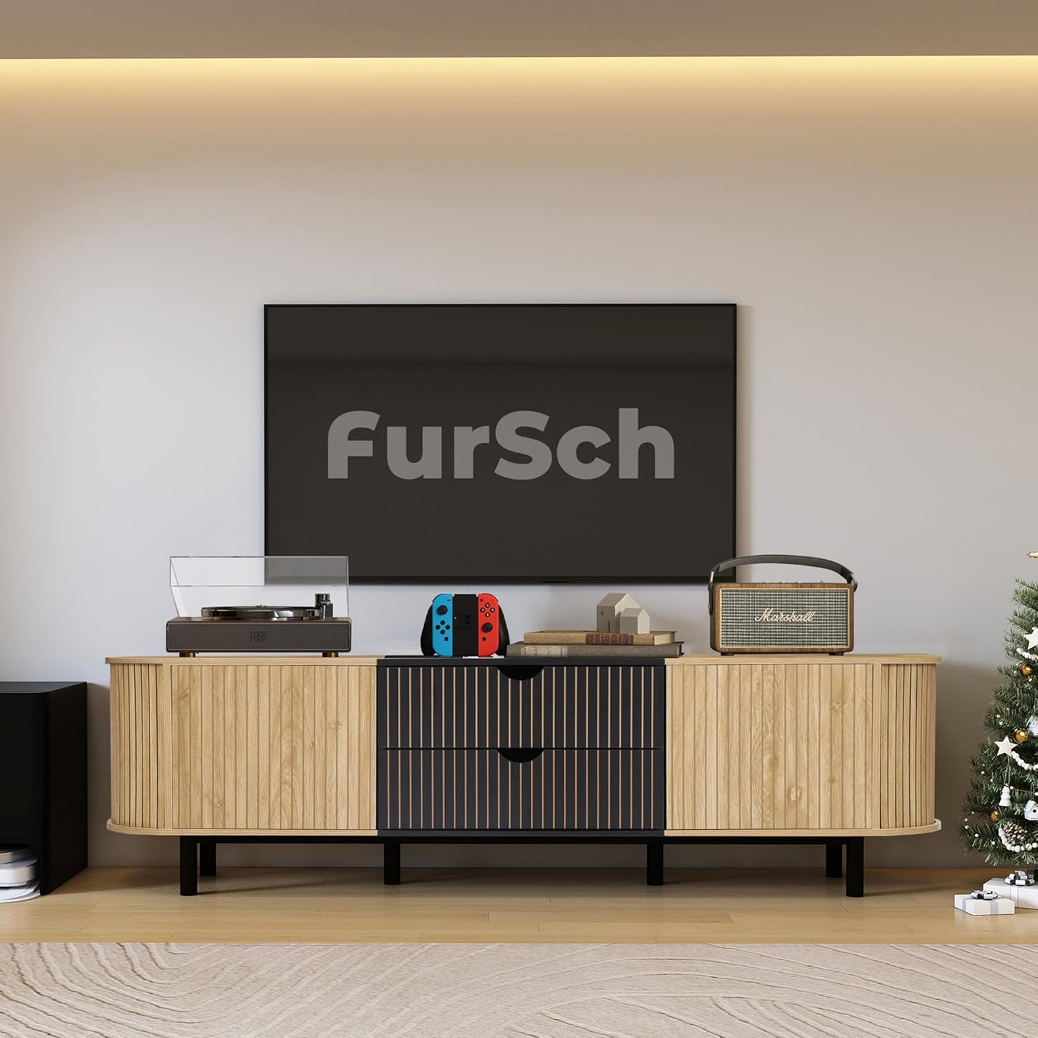 71" Tambour Door TV Stand,Wood Mid Century Modern TV Cabinet for Up to 85“ TV,Curved Edge Long TV Stand with Storage for Bedroom Living Room(Natural, 71inch)