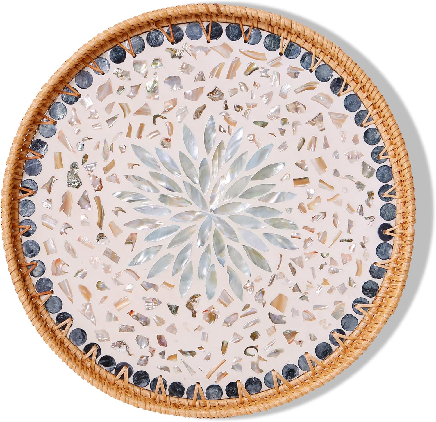 Round Rattan Tray with Mother of Pearl Inlay & Wooden Base - Decorative Wicker Serving Tray for Coffee/Bread/Fruits, Food Storage & Display - Multipurpose Home Decor (M,Fish Scales)