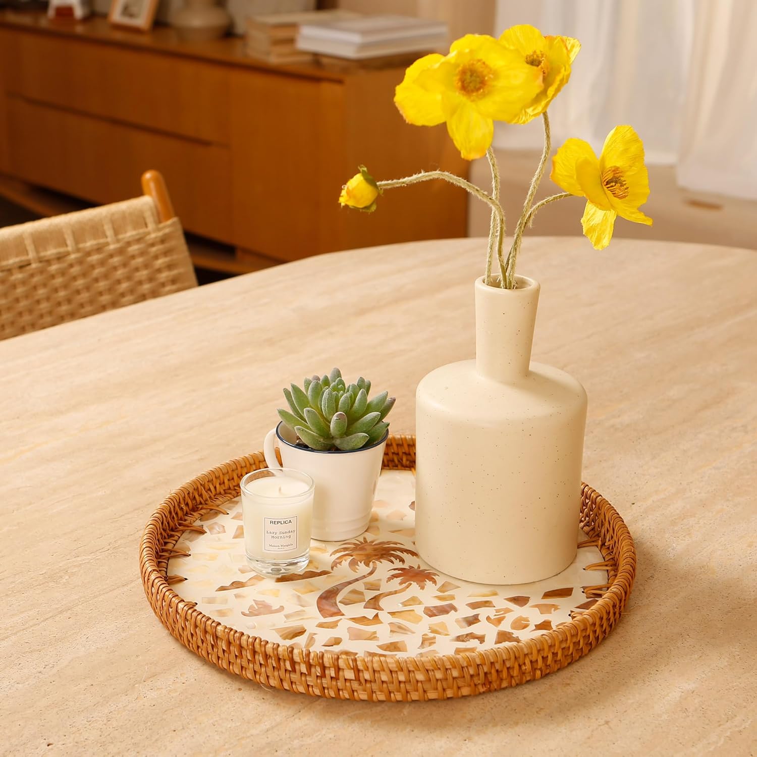 - Natural Rattan and Seashell Design: This tray is crafted from high-quality natural rattan, handwoven with beautiful seashell inlays at the base, showcasing a blend of natural materials and artistic craftsmanship