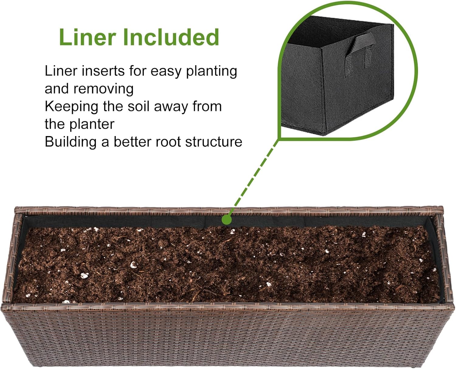 - Removable Liner: Each wicker planter comes with a nonwoven fabric liner (measures 35 x 10 x 10 inch) that separates wicker from the soil. Keep planter in excellent condition to prevent weeds and other invasive species from interfering with plant growth