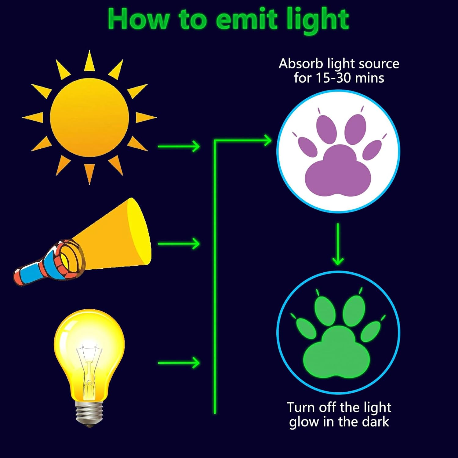 - β¦ Glow Paw Prints Wall Decals: These glow wall decals for ceiling are made of quality luminous material,they will glow brightly when absorb enough light during the day. You just need to put it under lamplight flashlight ,room light or sunshine for 15 minutes, it will keep glowing for 8-10 hours with a gentle green fluorescent light. Please ensure the light shines on the decals without obstruction, the longer it takes to absorb light, then to light up for up to longer.