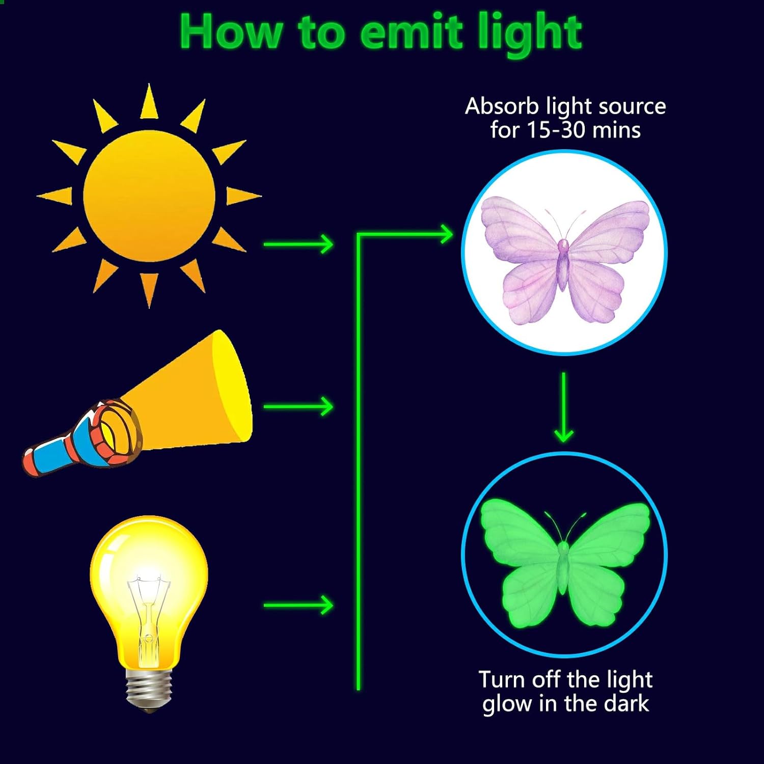 - β¦ Glow Butterfly Wall Decals: These glow wall decals for ceiling are made of quality luminous material,they will glow brightly when absorb enough light during the day. You just need to put it under lamplight flashlight ,room light or sunshine for 15 minutes, it will keep glowing for 8-10 hours with a gentle green fluorescent light. Please ensure the light shines on the decals without obstruction, the longer it takes to absorb light, then to light up for up to longer.