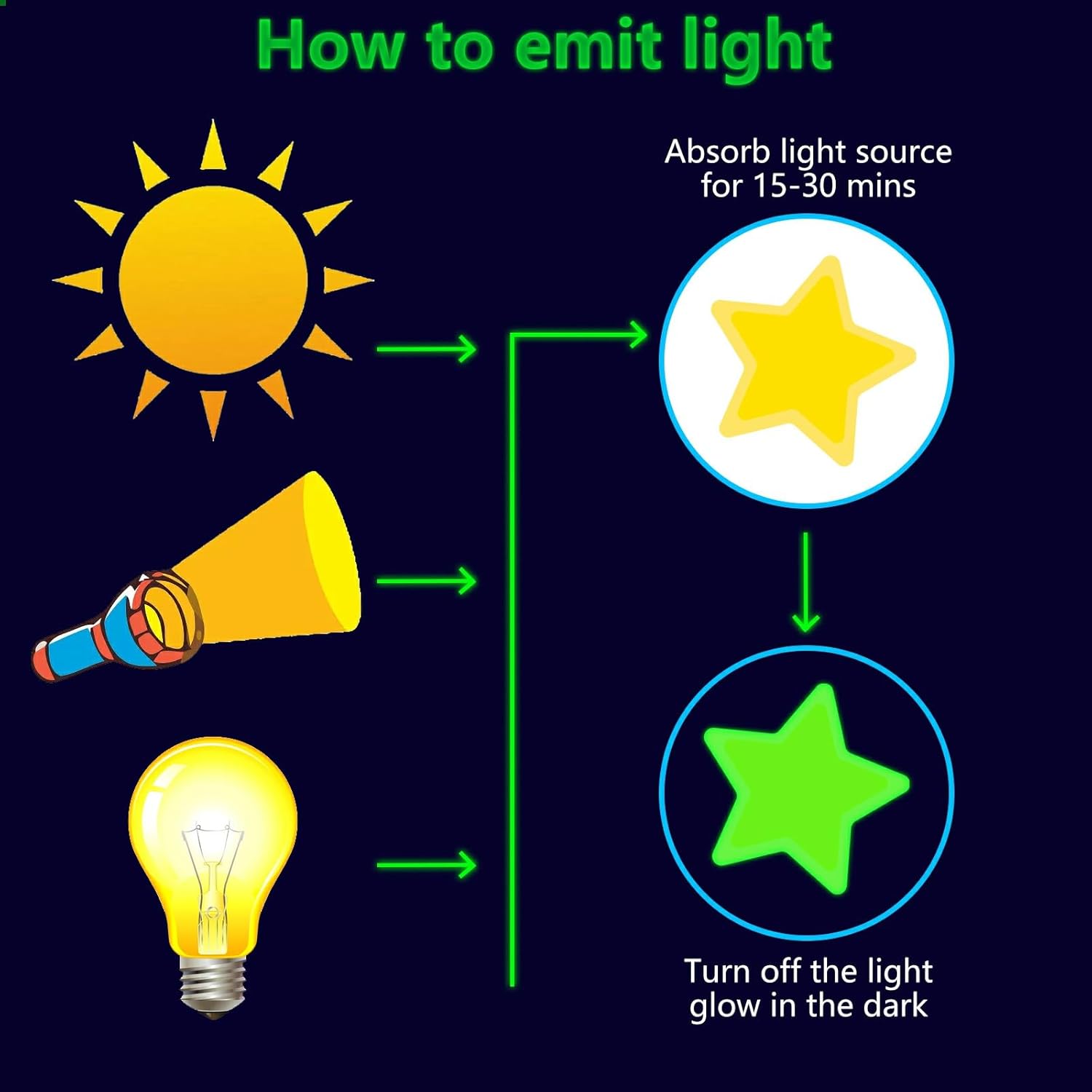 - β¦ Glow Stars Wall Decals: These glow wall decals for ceiling are made of quality luminous material,they will glow brightly when absorb enough light during the day. You just need to put it under lamplight flashlight ,room light or sunshine for 15 minutes, it will keep glowing for 8-10 hours with a gentle green fluorescent light. Please ensure the light shines on the decals without obstruction, the longer it takes to absorb light, then to light up for up to longer.