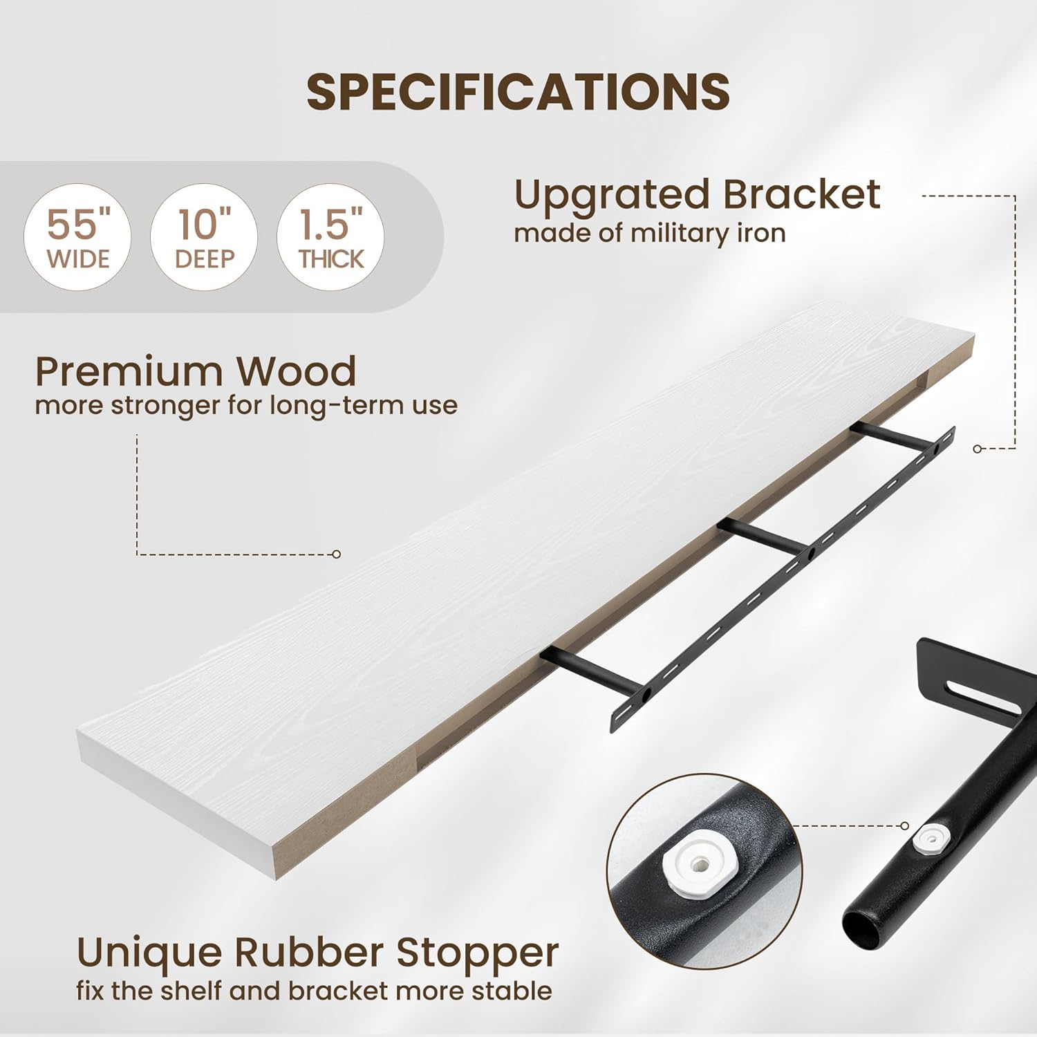 - INVISIBLE & STURDY BRACKET: This floating shelf features a simple and elegant design with an invisible bracket that creates a floating effect. The sturdy hidden support and special rubber stoppers ensure the shelf stays firmly in place, offering both strength and a clean, modern style
