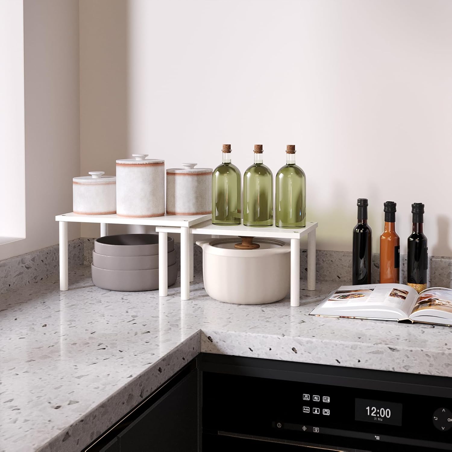 - 【Flexible Combination, Space Optimization】With their unique design, with one slightly smaller than the other, these shelf organizers can be stacked on top of one another, nested, used separately, or even in an L-shape.It is a flexible storage solution that transforms your kitchen into a more organised and tidy space.