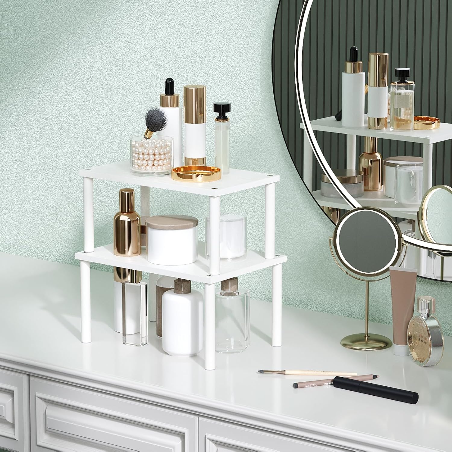 Cabinet Organizer Shelf(Set of 2),Kitchen Counter Shelves,Bamboo Spice Rack Countertop and Cabinet,Stackable Expandable,Medium,(White)