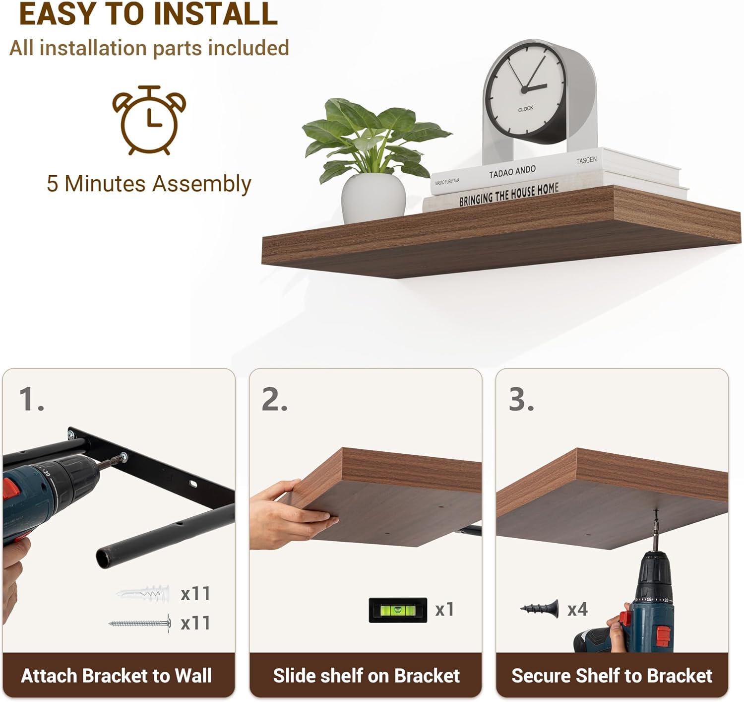 - ăEasy InstallationăDesigned with user convenience in mind, these shelves come with all necessary mounting hardware and clear instructions. You can have them up and ready to use in less than 5 minutes. Plus, our customer service is always ready to assist with any queries or concerns, ensuring a hassle-free experience