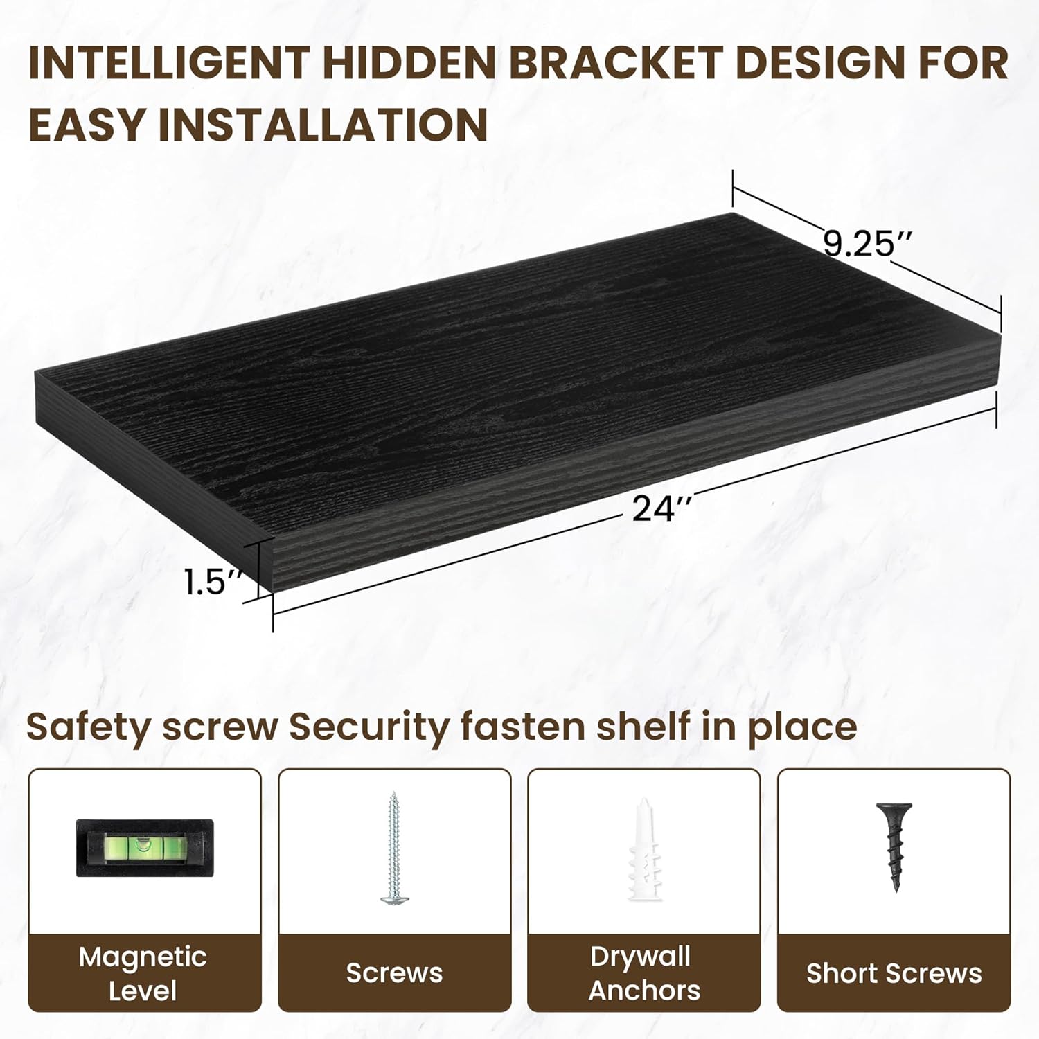 24 Inch Floating Shelves, 24"x9.25"x1.5" Inch Deep Floating Shelves for Wall, Wooden Shelves for Bathroom, Bedroom, Living Room, Black