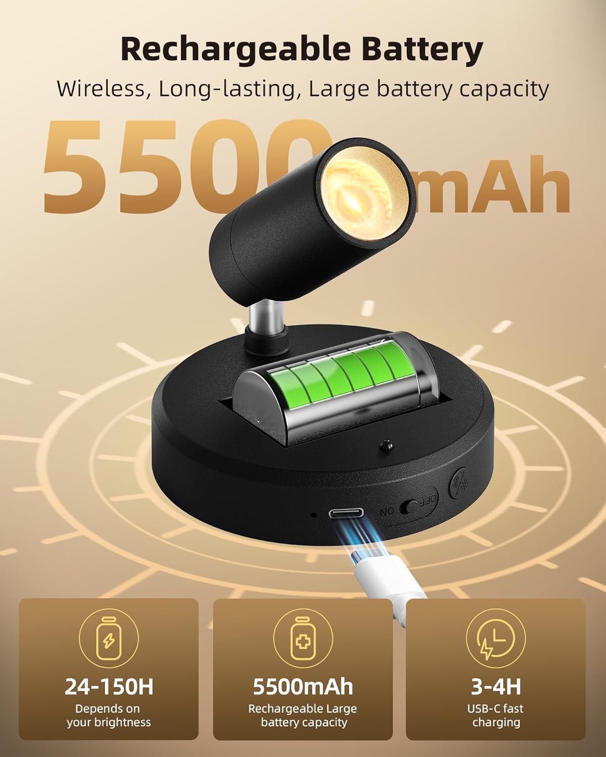 - 5500mAh Rechargeable Spotlight: The EZVALO plant spotlight indoor features a powerful 5500mAh rechargeable battery, Provide up to 150 hours of low brightness and 24-25 hours of high brightness lighting.Using the equipped USB-C fast charging, Battery operated spot light can be fully charged within 4 hours, providing cordless, long-lasting 100 lumens glare-free lighting,Very suitable for indoor plant lighting and picture lighting