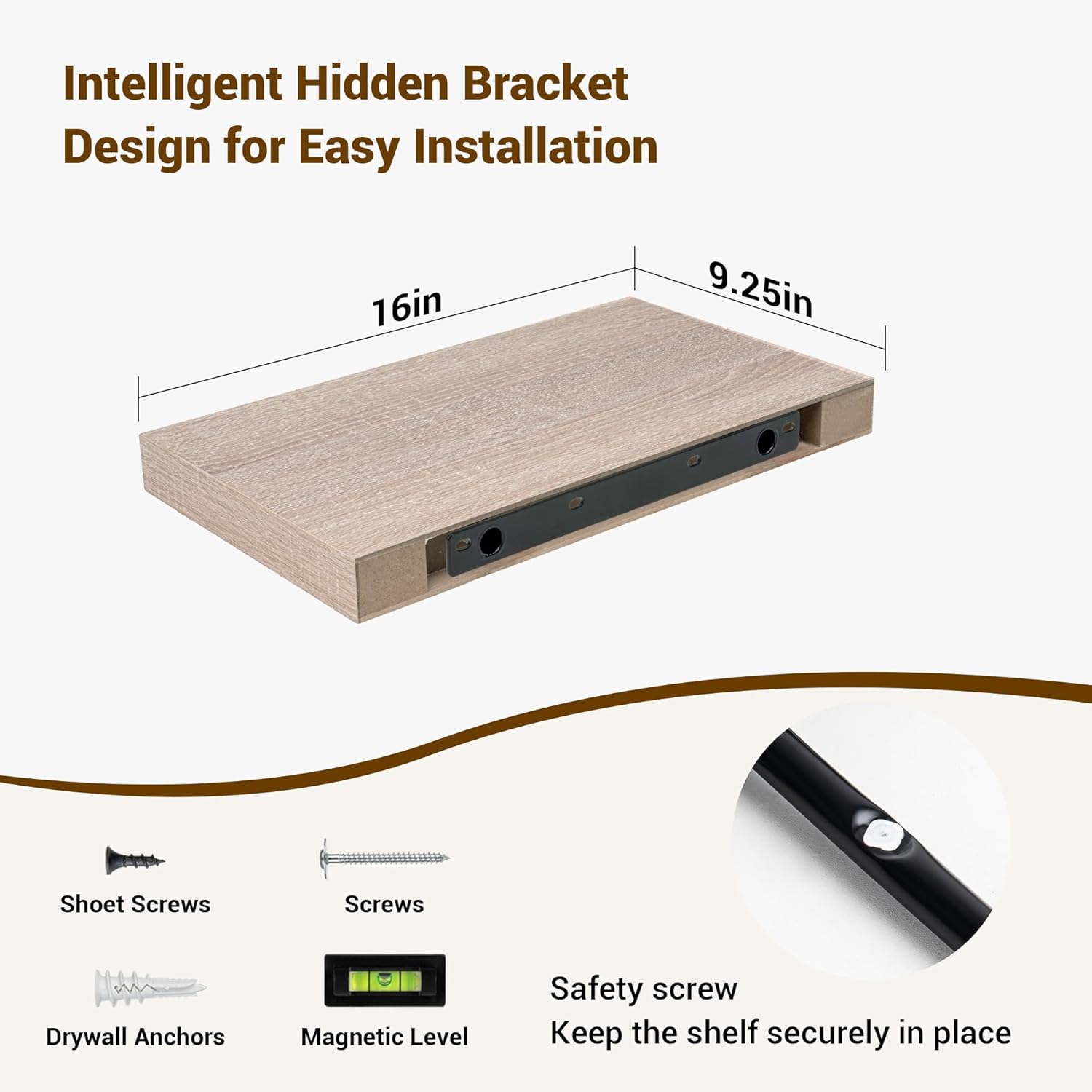 - ăPremium Quality ConstructionăCrafted from high-grade engineered wood with an invisible one-piece bracket, these floating shelves offer a robust and sleek design. The rustic wooden grain finish not only adds a touch of elegance but also infuses warmth into any room, making them a perfect fit for both modern and traditional interiors.