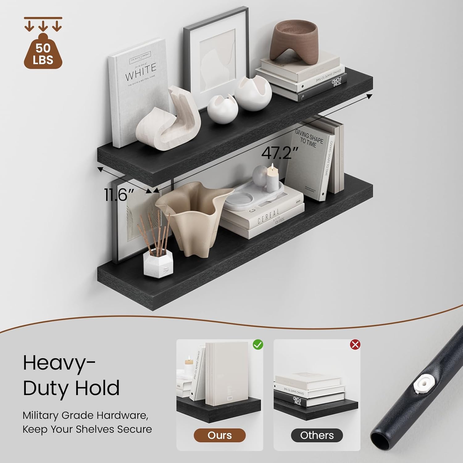 - Enhanced Durability: Heimlove wall shelves are built with military-grade iron hardware and engineered wood. With heavy-duty metal brackets, they provide long-lasting strength and stability for all your items. A high load capacity of up to 25 pounds. The sleek, invisible design adds a touch of elegance to any space.