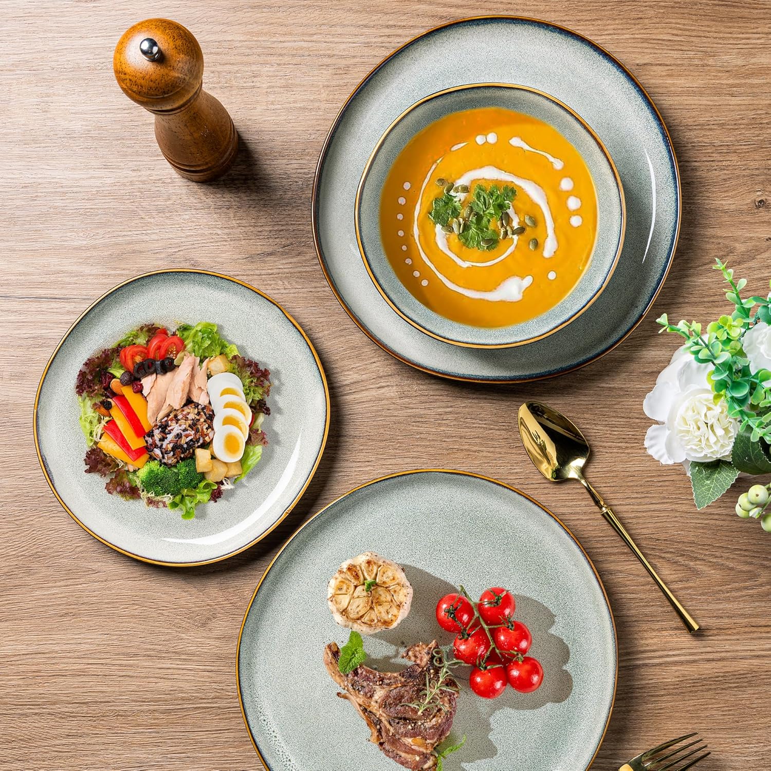 - EVERY PLATE IS UNIQUE: This dinerware set are fired with two different glazes, so the surface develops a beautiful color and makes your food looked even more delicious. The reactive glaze makes every plate unique. Since our glaze is all-natural, it tends to change color depending on the lighting. The color may be a tad different from what you see on your screen, but every item is beautiful. Our glaze is also extra strong to prevent scratches from your knives and forks.