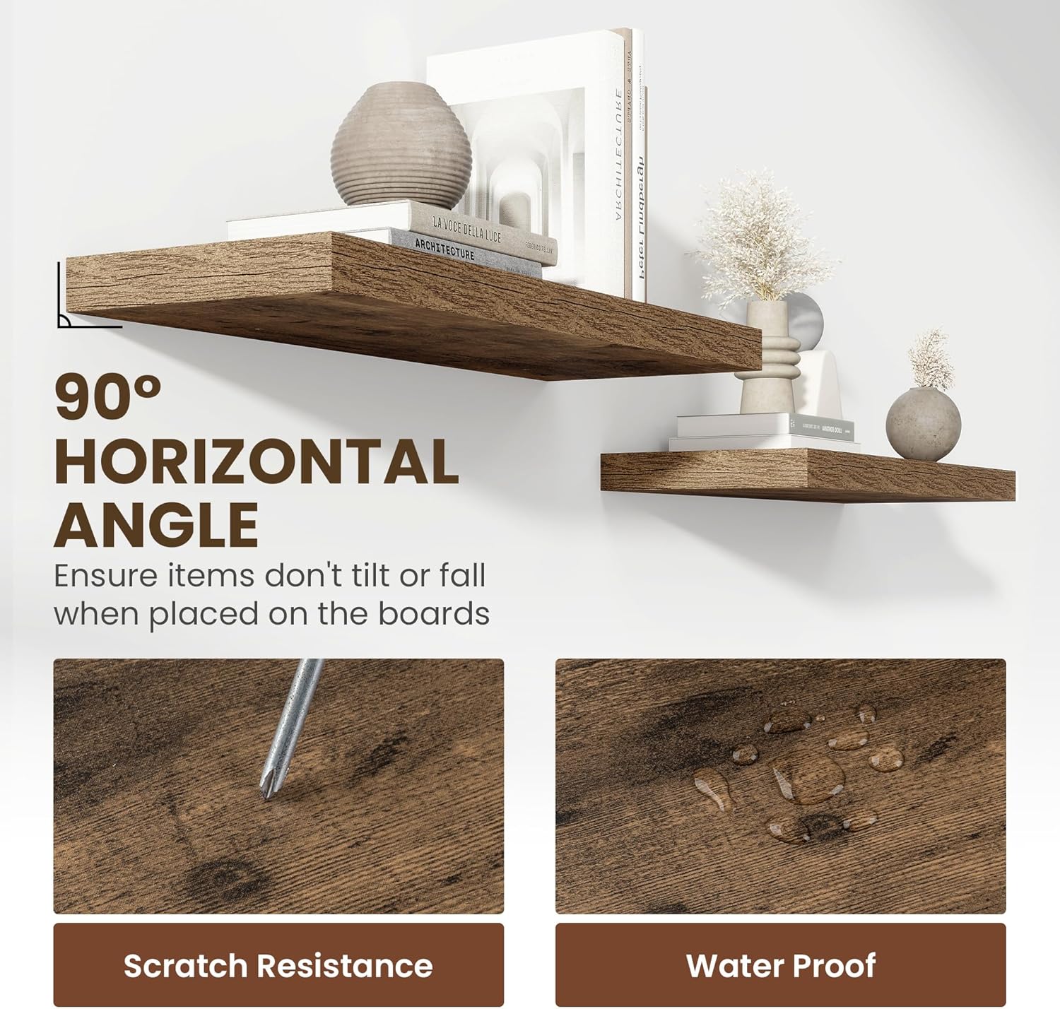 - ăPremium Quality ConstructionăCrafted from high-grade engineered wood with an invisible one-piece bracket, these floating shelves offer a robust and sleek design. The rustic wooden grain finish not only adds a touch of elegance but also infuses warmth into any room, making them a perfect fit for both modern and traditional interiors.