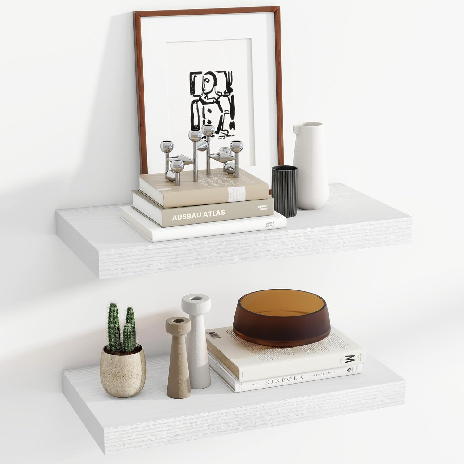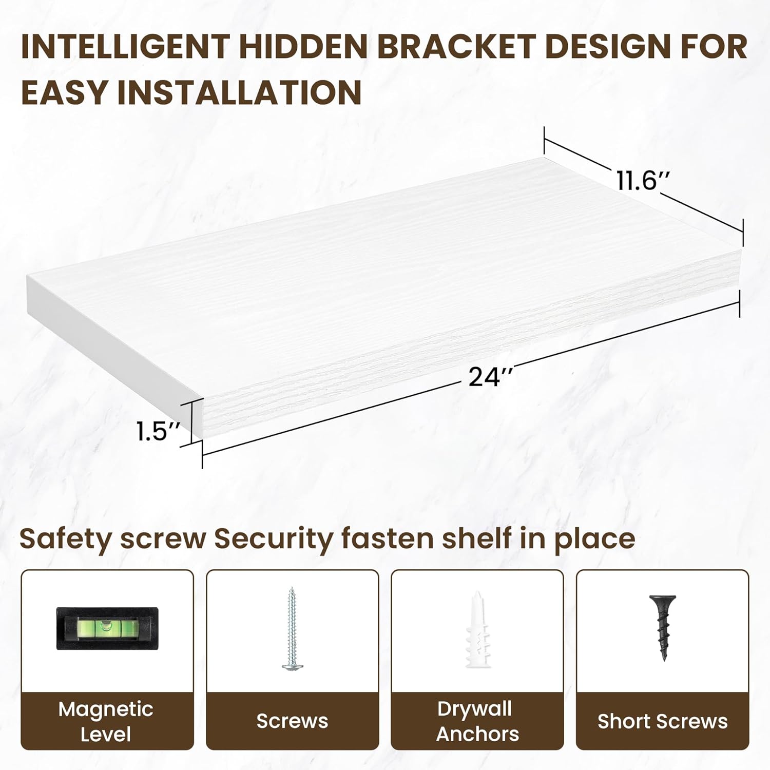 24 Inch Floating Shelves, 11.6 Inch Deep Floating Shelves for Wall, Floating Shelf with Invisible Brackets, Deep Shelves for Bathroom, Bedroom, Living Room, 2 Pack, White
