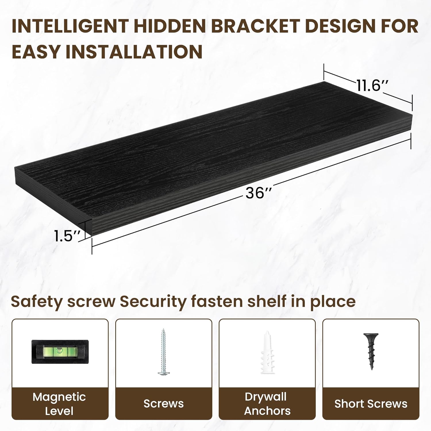 36 Inch Floating Shelves, 11.6 Inch Deep Floating Shelves for Wall, Floating Shelf with Invisible Brackets, Deep Shelves for Bathroom, Bedroom, Living Room, 2 Pack, Black