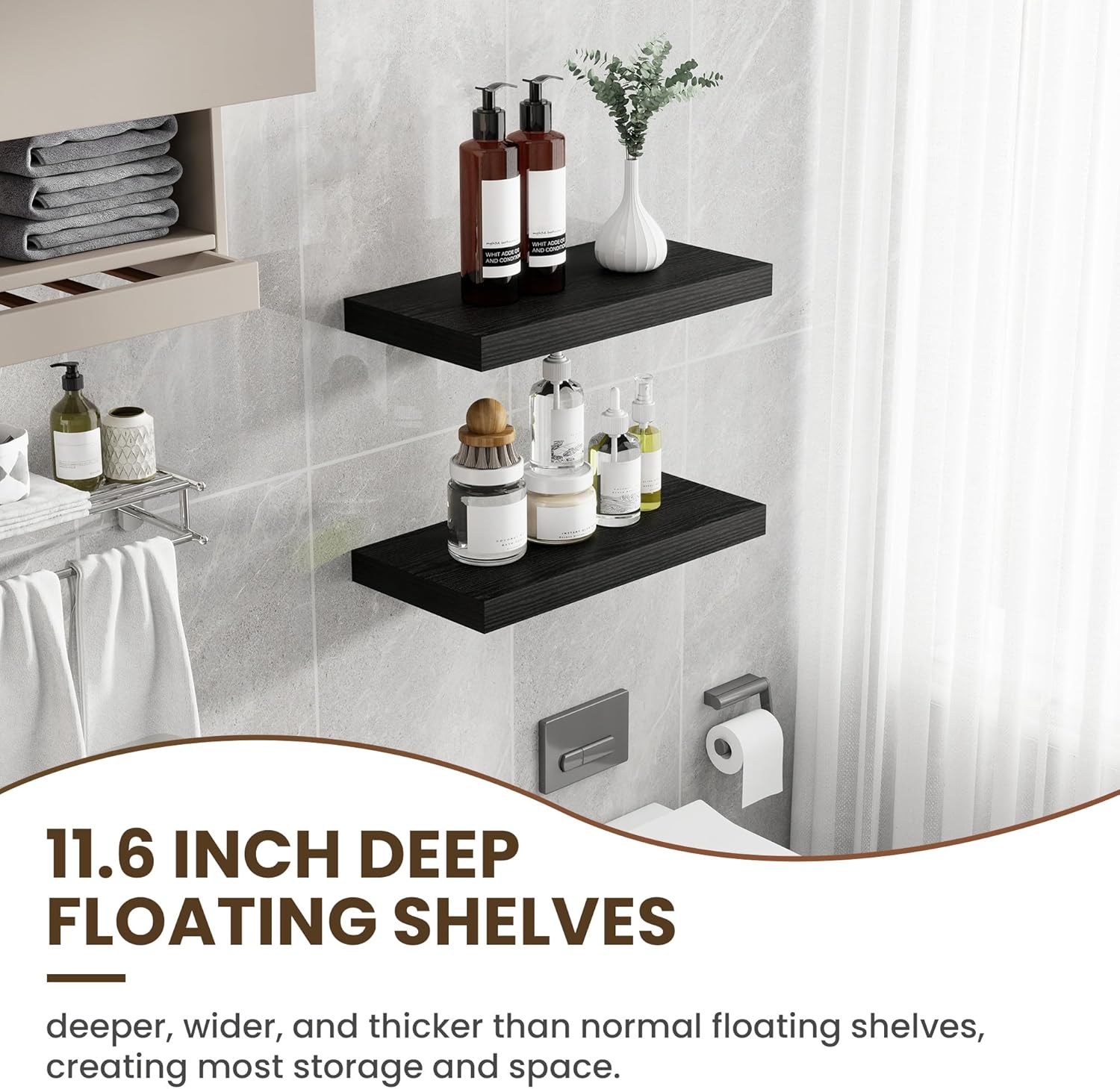 24 Inch Floating Shelves, 11.6 Inch Deep Floating Shelves for Wall, Floating Shelf with Invisible Brackets, Deep Shelves for Bathroom, Bedroom, Living Room, 2 Pack, Black
