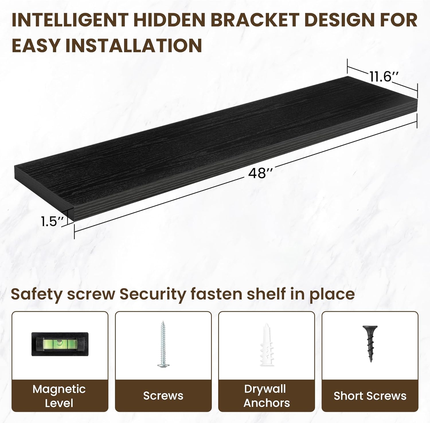 - ăEasy InstallationăDesigned with user convenience in mind, these shelves come with all necessary mounting hardware and clear instructions. You can have them up and ready to use in less than 5 minutes. Plus, our customer service is always ready to assist with any queries or concerns, ensuring a hassle-free experience