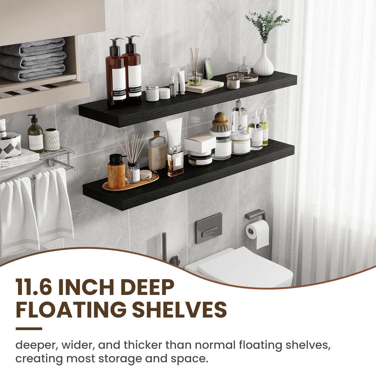 48 Inch Floating Shelves, 11.6 Inch Deep Floating Shelves for Wall, Floating Shelf with Invisible Brackets, Deep Shelves for Bathroom, Bedroom, Living Room, 1 Pack, Black