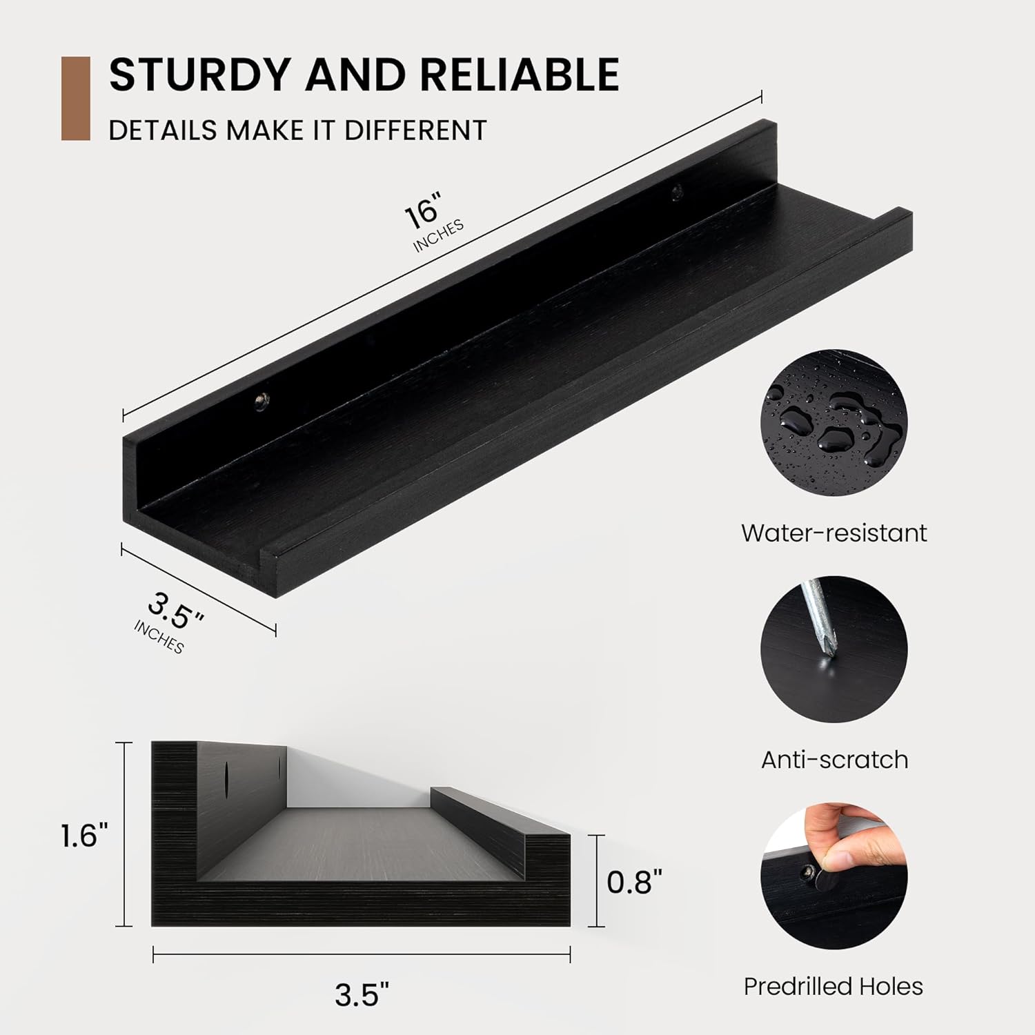 Picture Ledge Shelf, Solid Pine Wood Floating Shelves Set of 4, 16 Inches Nursery Book Shelves for Toys Storage, Kids Bookshelf Wall Mounted for Living Room Decor Photo Frames, Black