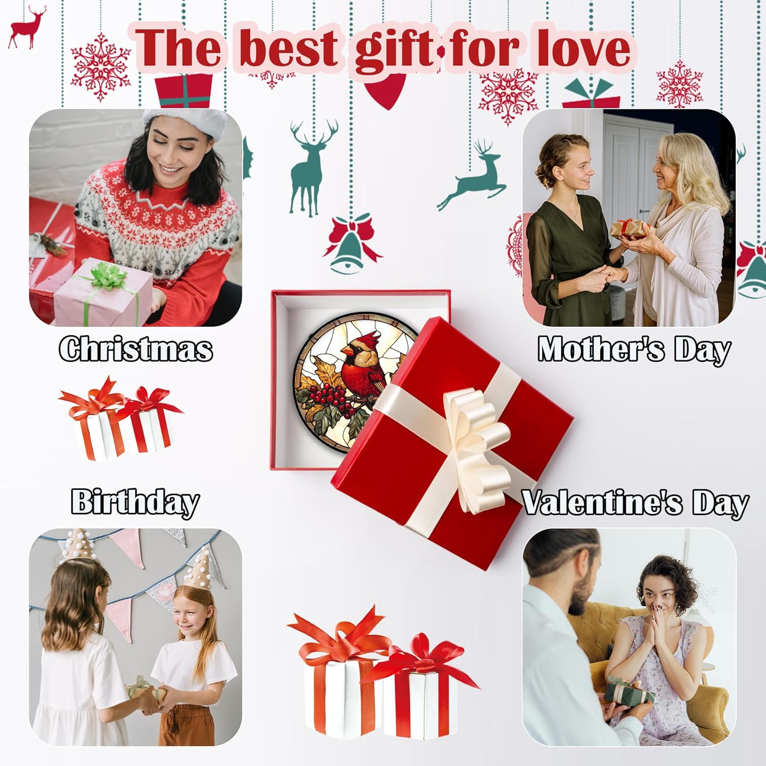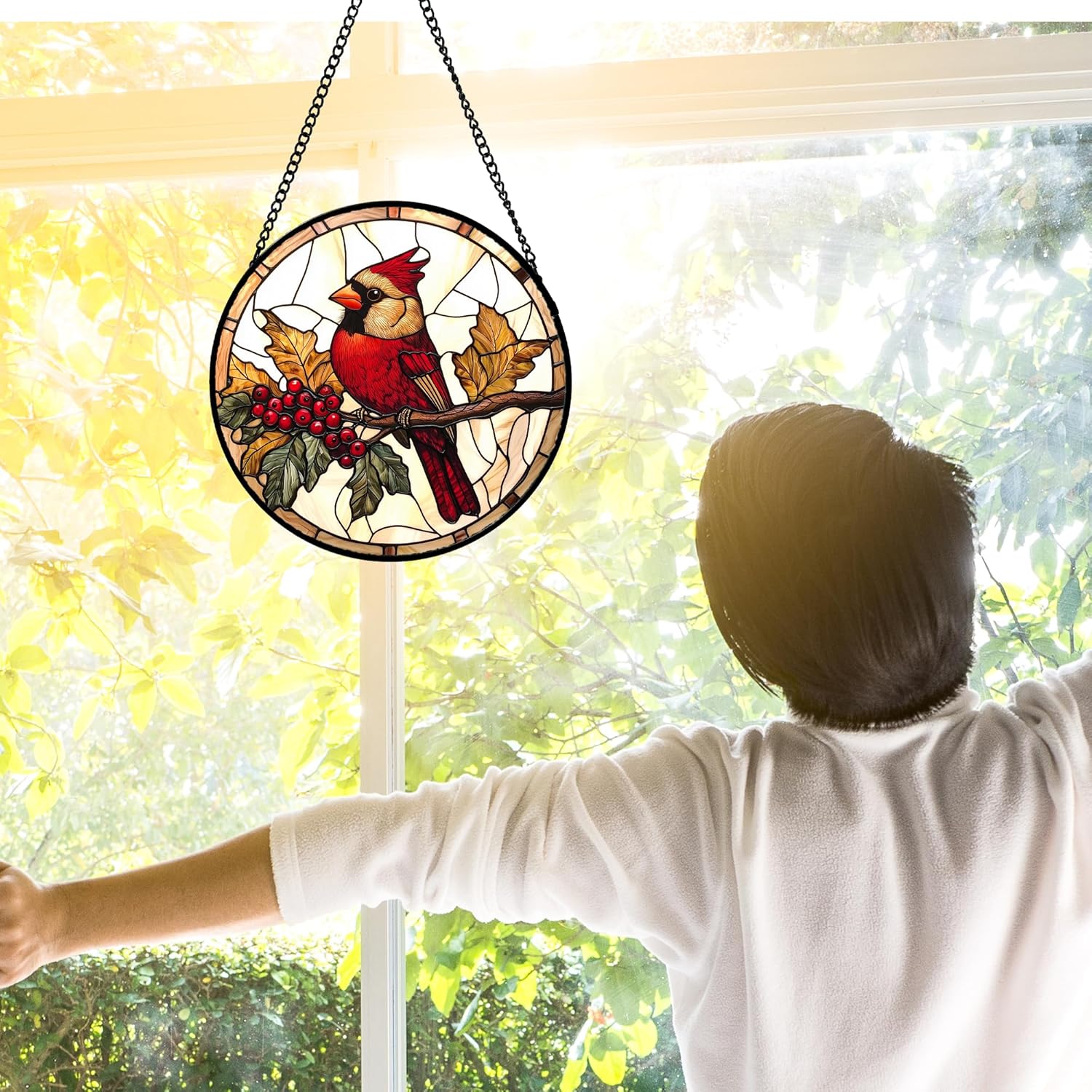 Stained Glass Window Hanging, Birds on a Branch Cardinal Sun Catchers Diamond Glass Panel Hangings Suncatcher Decor for Birthday for Women, Men, Wife, Aunt, and Mom 6.3 in