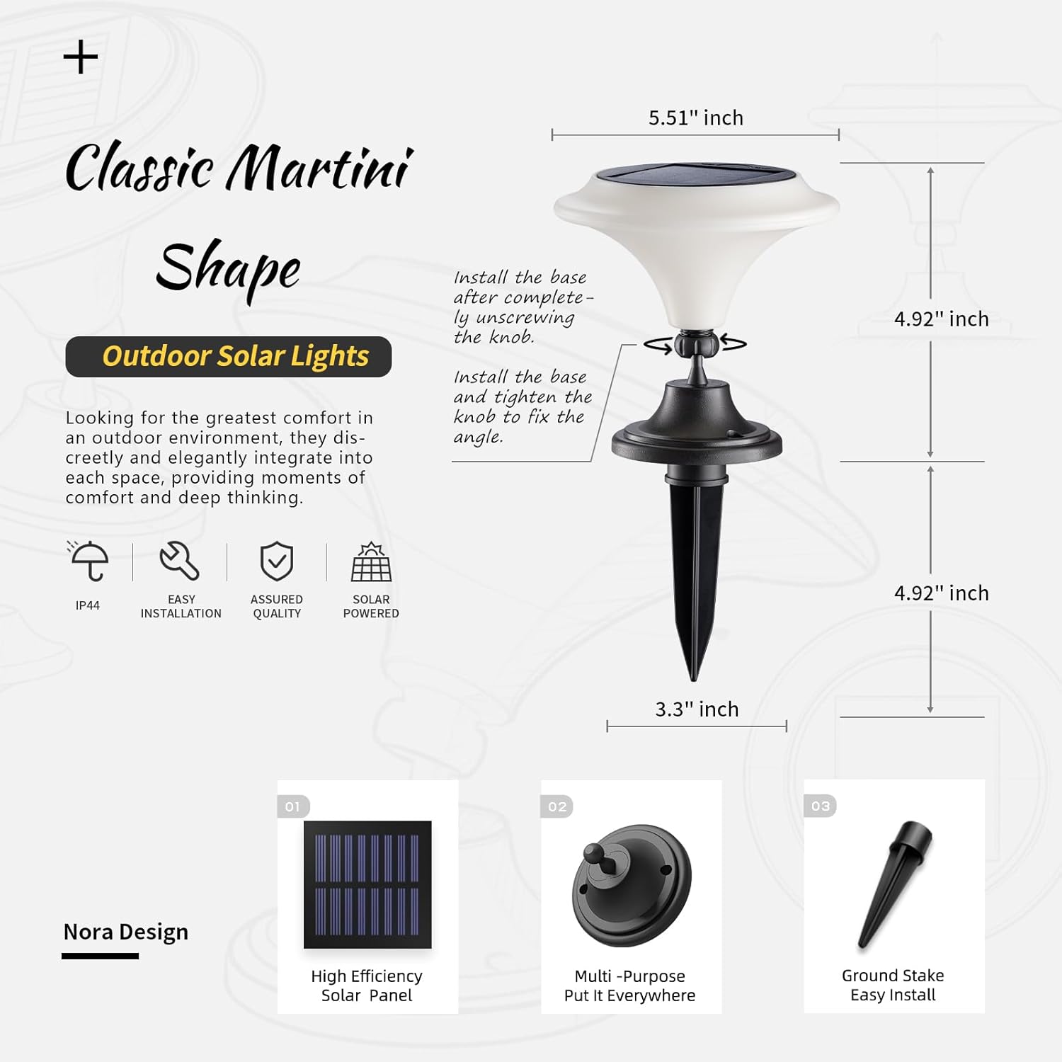 - Classic Martini-shaped Design - Transform your outdoor space with our uniquely designed solar pathway lights featuring a sophisticated martini cup silhouette. The premium shade creates a soft, atmospheric warm white glow, while the adjustable head allows you to direct light where needed. Perfect for creating captivating lighting effects that enhance your garden's nighttime ambiance.