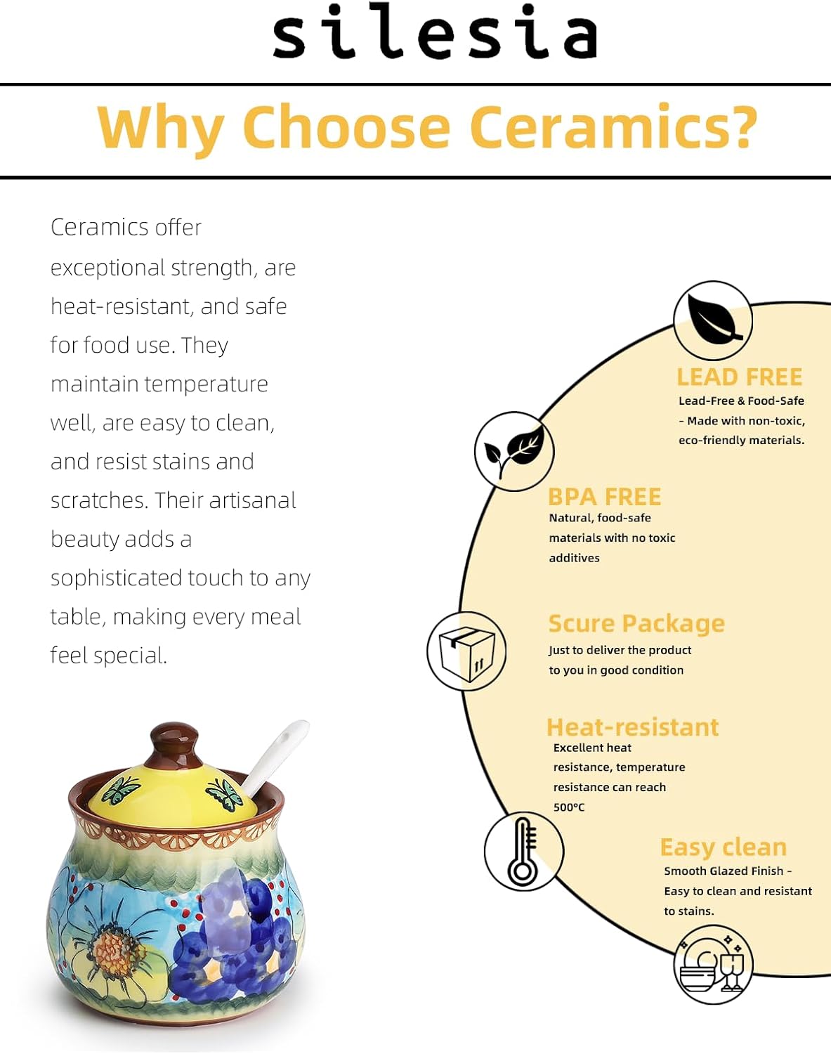 silesia Handmade Sugar Bowl with Lid and Spoon, 9 Ounce Ceramic Hand-Painted Sugar Jar for Home in Gift Box, Kitchen Decor, Oven, Dishwasher & Microwave Safe, Glazed Yellow