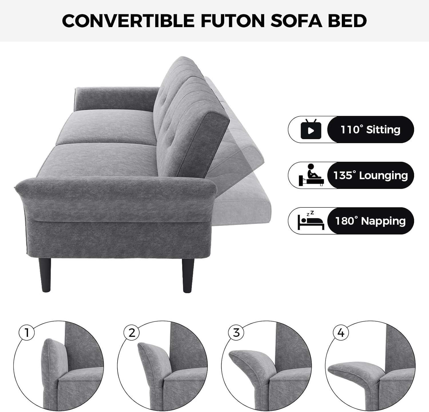 - 【Ideal Convertible Sofa】COPIAE’s futon sofa bed has a spacious dimension, which is enough to comfortably seat 2-3 people. Meanwhile, this is a versatile functionality sofa that has three adjustable split folding backrest settings available, can be switched between sofa, bed and recliner, the bed form size can be reached 89”L*42.1”W*16.9”H, suitable for living and guest rooms