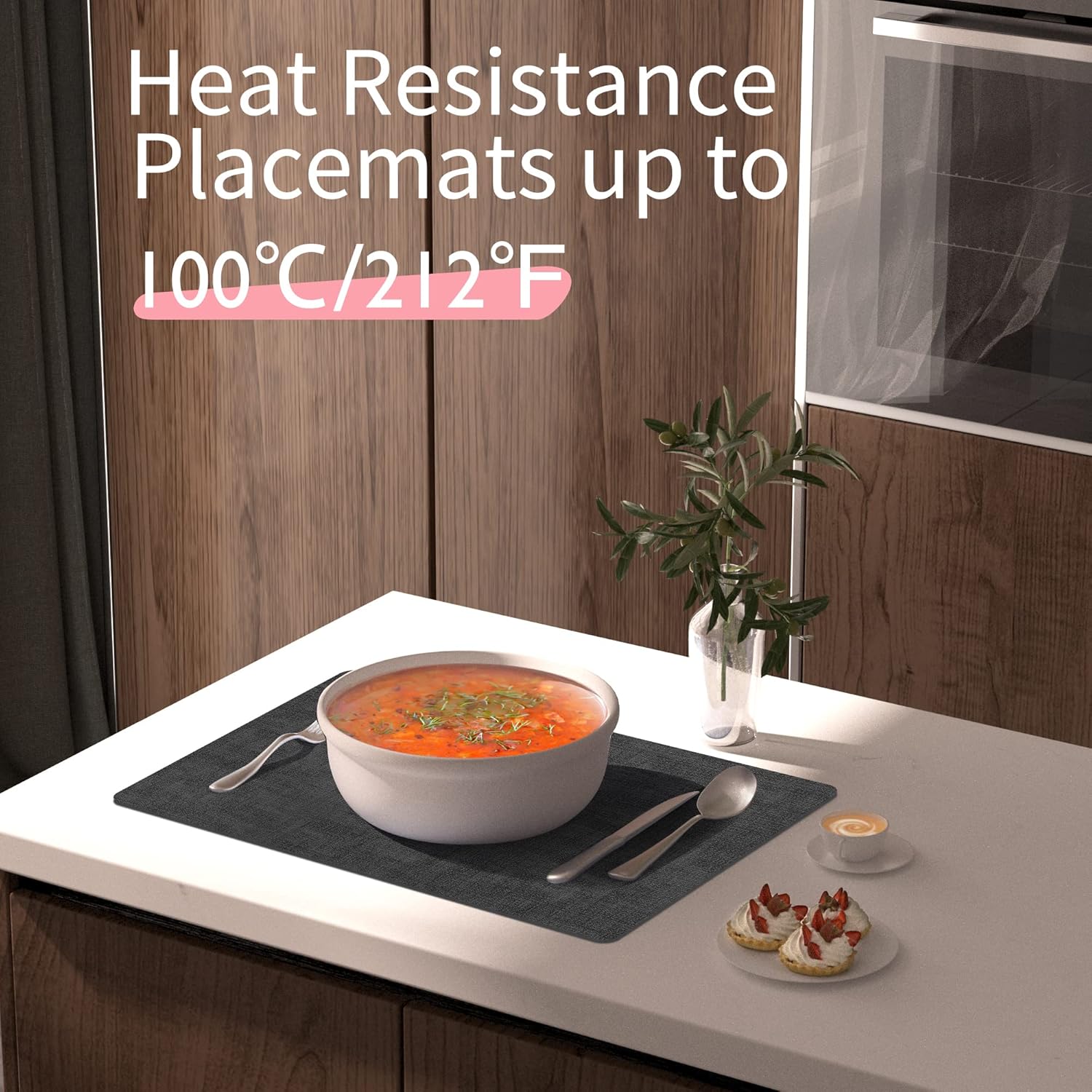 - EASY CARE: Designed for ease of use, these durable table mats withstand any spills and stains, making clean-up a breeze. Just with a simple wipe with a rag or a rinse under the tap, they'll be spotless and ready for your next meal.