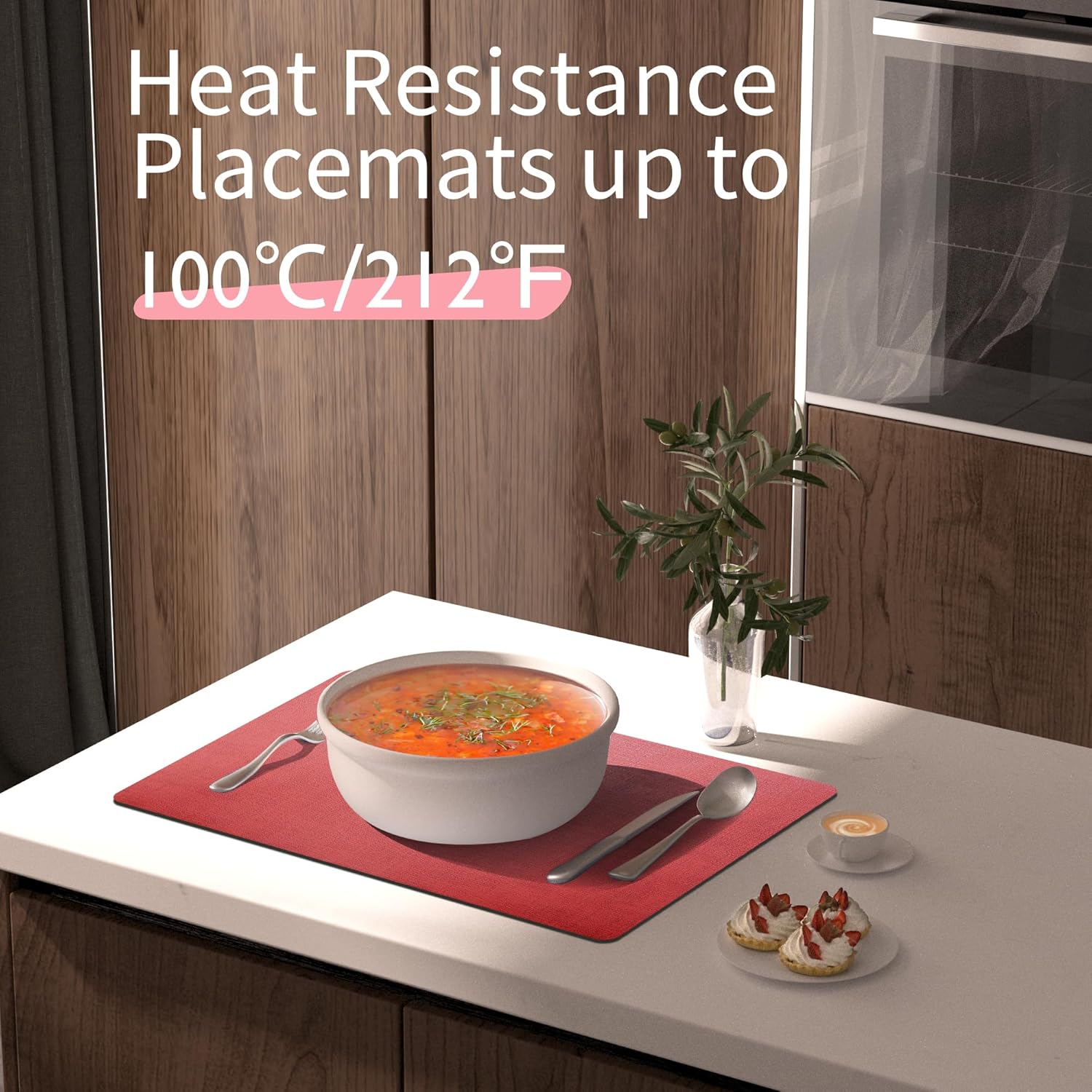 - HEAT RESISTANCE - UP TO 212 °F (100 °C): These quality dining table place mats are with 2mm thickness to protect your dining table from white heat marks. Each is sealed with a durable coating that is both stain and heat resistant to 212 °F.