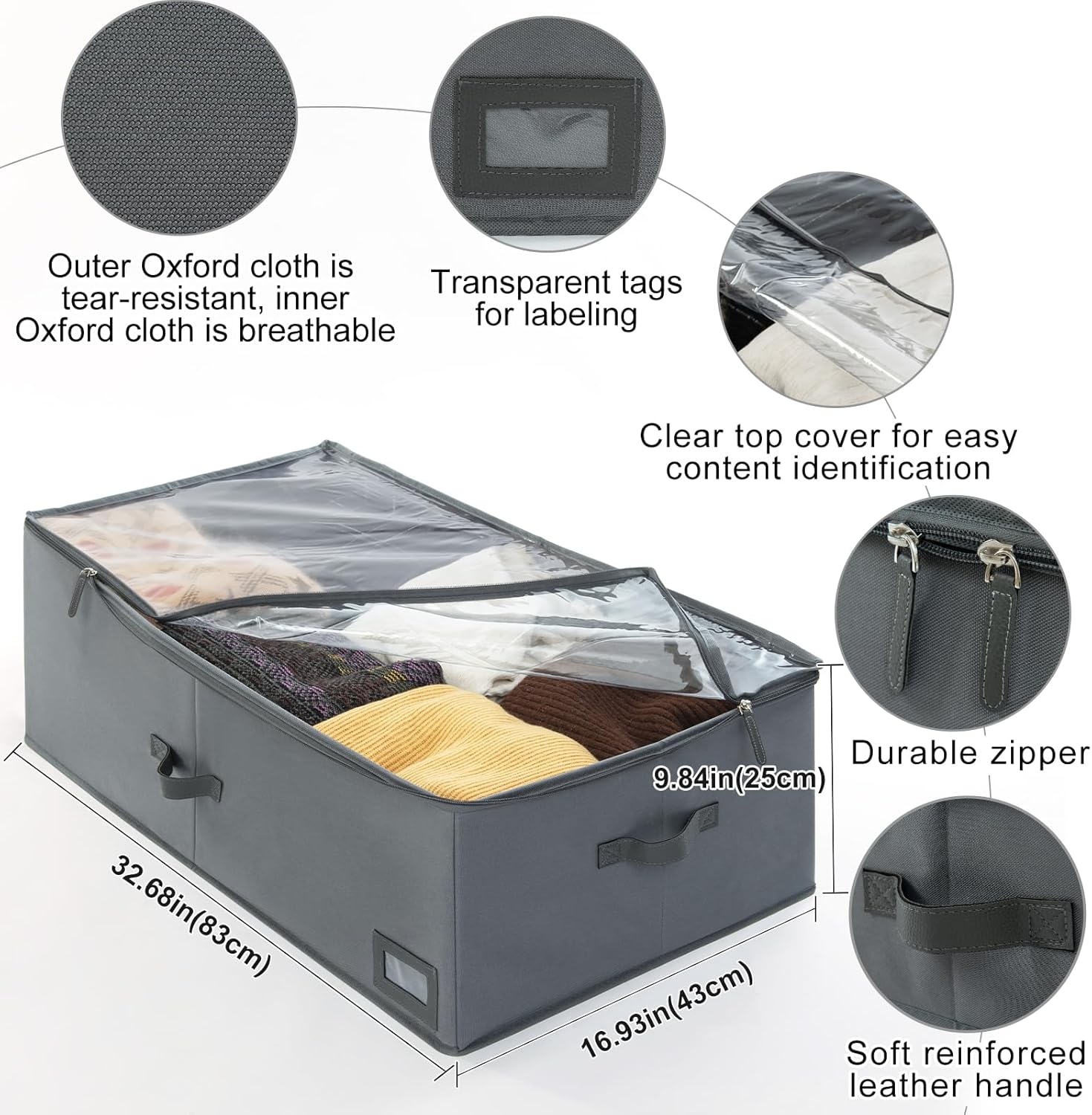 - USER-FRIENDLY DESIGN: This under-bed storage box has a thoughtful design. Despite its low profile, it boasts impressive storage capacity and is easy to assemble. A transparent PVC top window lets you quickly view contents, while a label pocket aids organization for easy access. Its double-zipper design ensures smooth opening/closing, and three handles allow effortless pulling from any direction