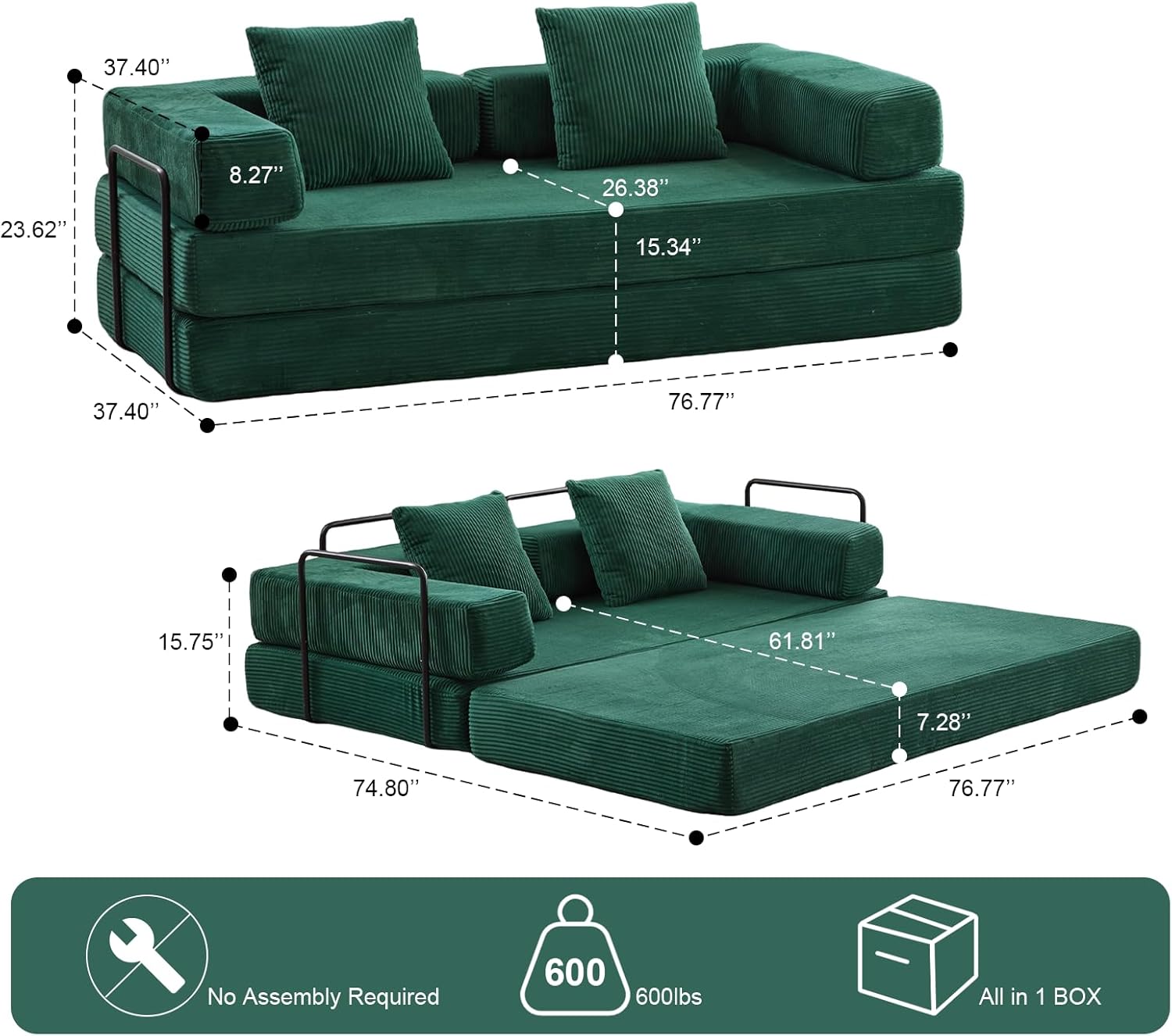 Convertible Sleeper Sofa Bed, Compression Folding Sofa with Pillow, No Assembly Required, Shape Frame, Floor Sofas Lounge Couch for Living Room, Bedroom, Small Spaces(Corduroy, 77''W, Dark Green)