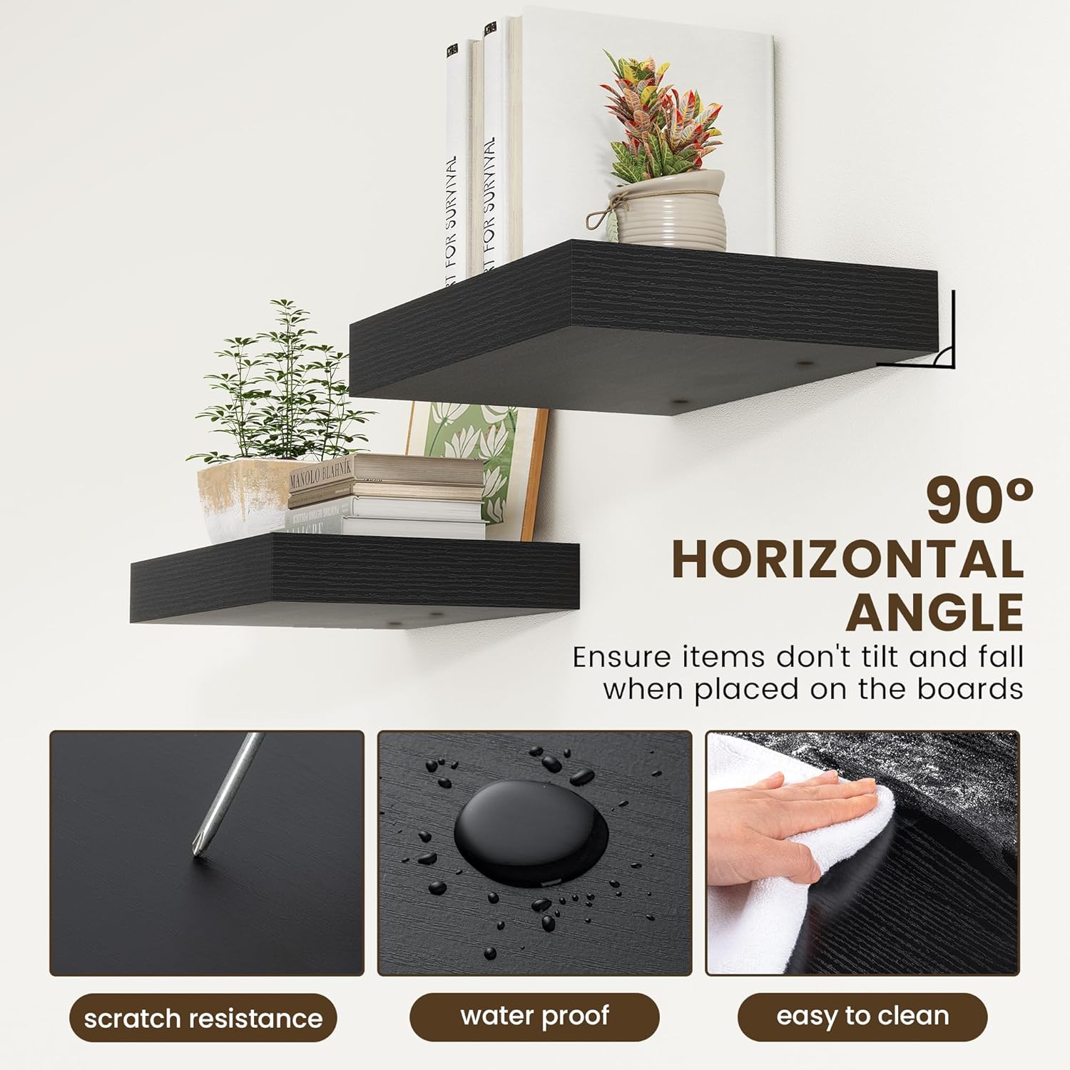 - UPGRADED MOUNTING SYSTEM-The extended supporting bars on the metal brackets ensure our wall shelves remain sturdy, preventing any wobbling or sagging. Plus, the included plastic plugs guarantee the shelves to stay firmly in place