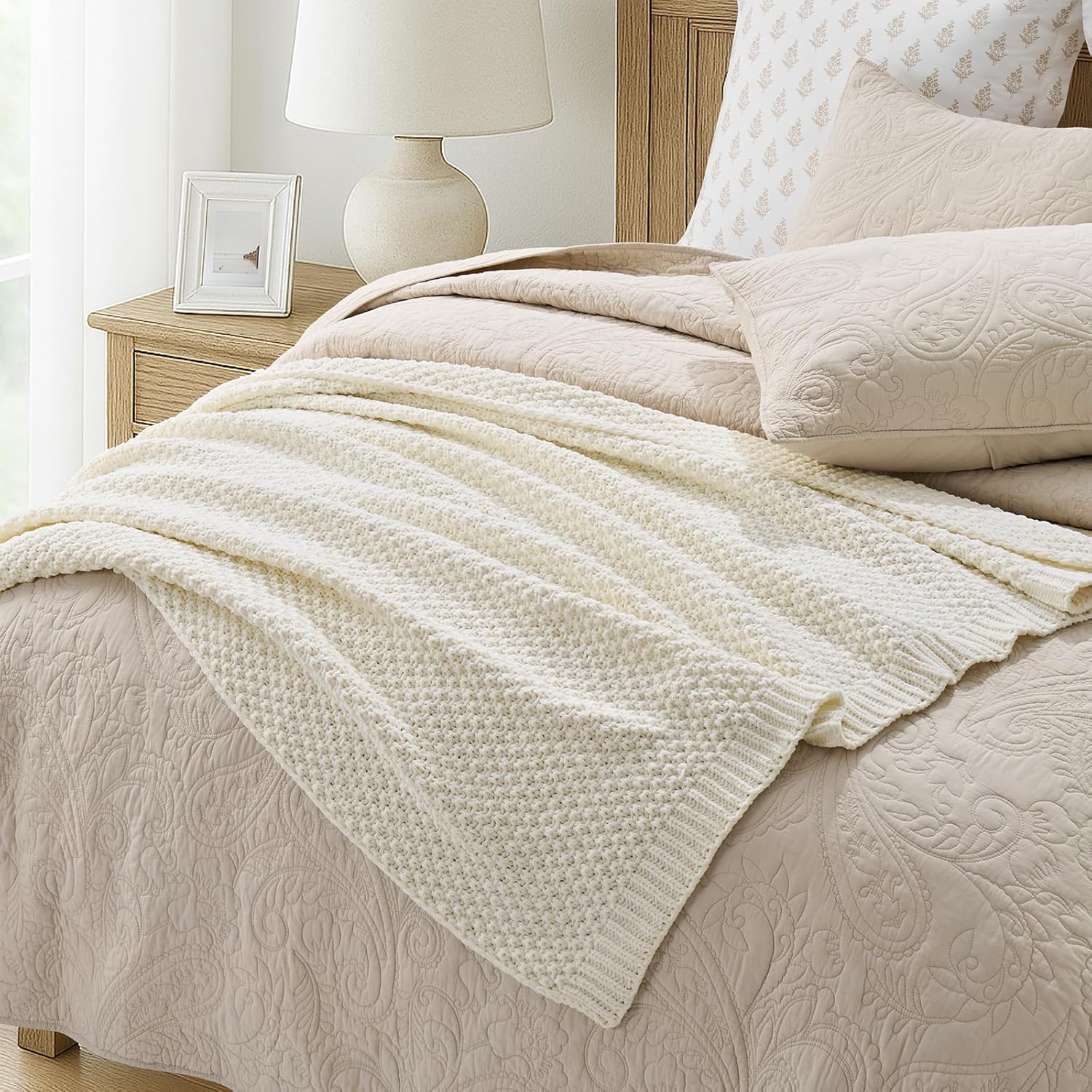 Chunky Chenille Knit Throw Blanket for Couch, Soft Luxurious Moss Stitch Blankets for Bed, Cozy Decorative Farmhouse Knitted Throws for Sofa, Ivory White, 60" x 80"