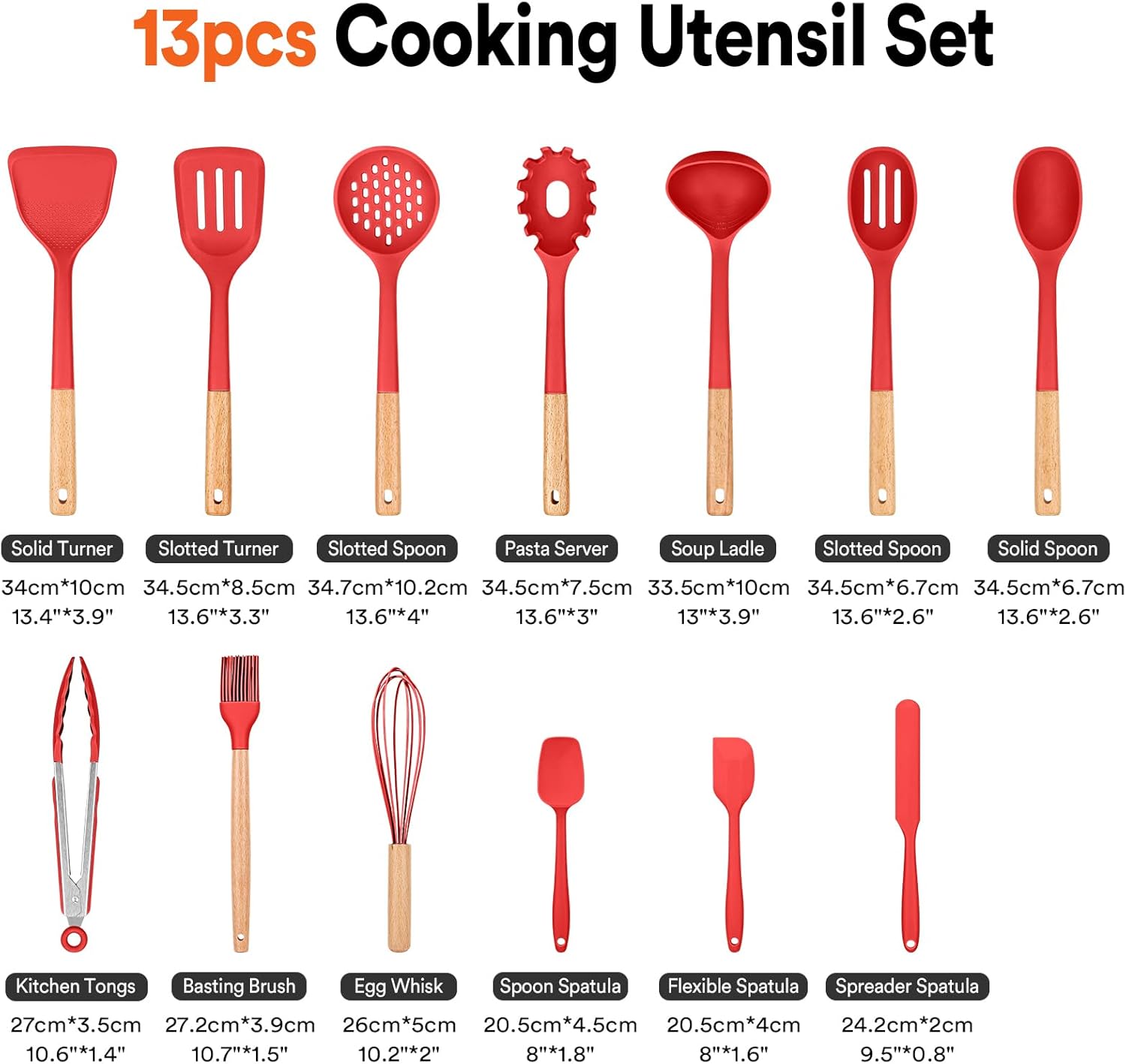 Kitchen Utensils Set, 13PCS Silicone Cooking Utensils, Heat Resistant Kitchen Utensil Spatula Set for Nonstick Cookware, Wooden Handles Kitchen Gadgets Tools Set (RED)