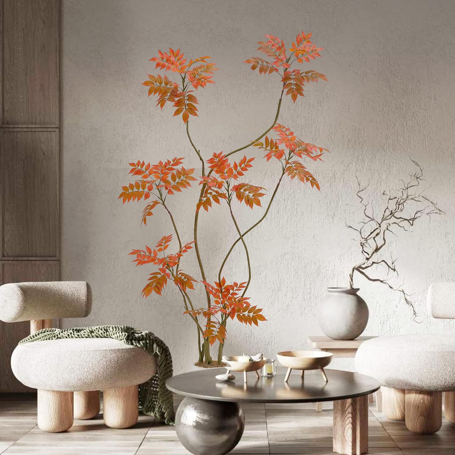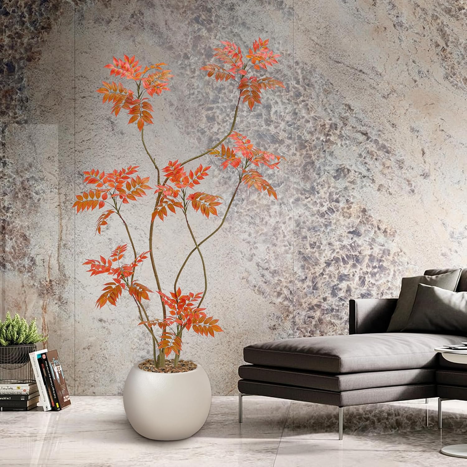 - Home Decor Accents: This 6ft/70in tall faux sumac tree contains 500 pieces real touch leaves who made of silk and each leaf has veins on it. Inclus a white planter(10"H x 10"W). The interior of the planter is made of sturdy concrete and the surface is decorated with non-falling coloured pebbles and the base use anti-tip tilt protection for greater stability