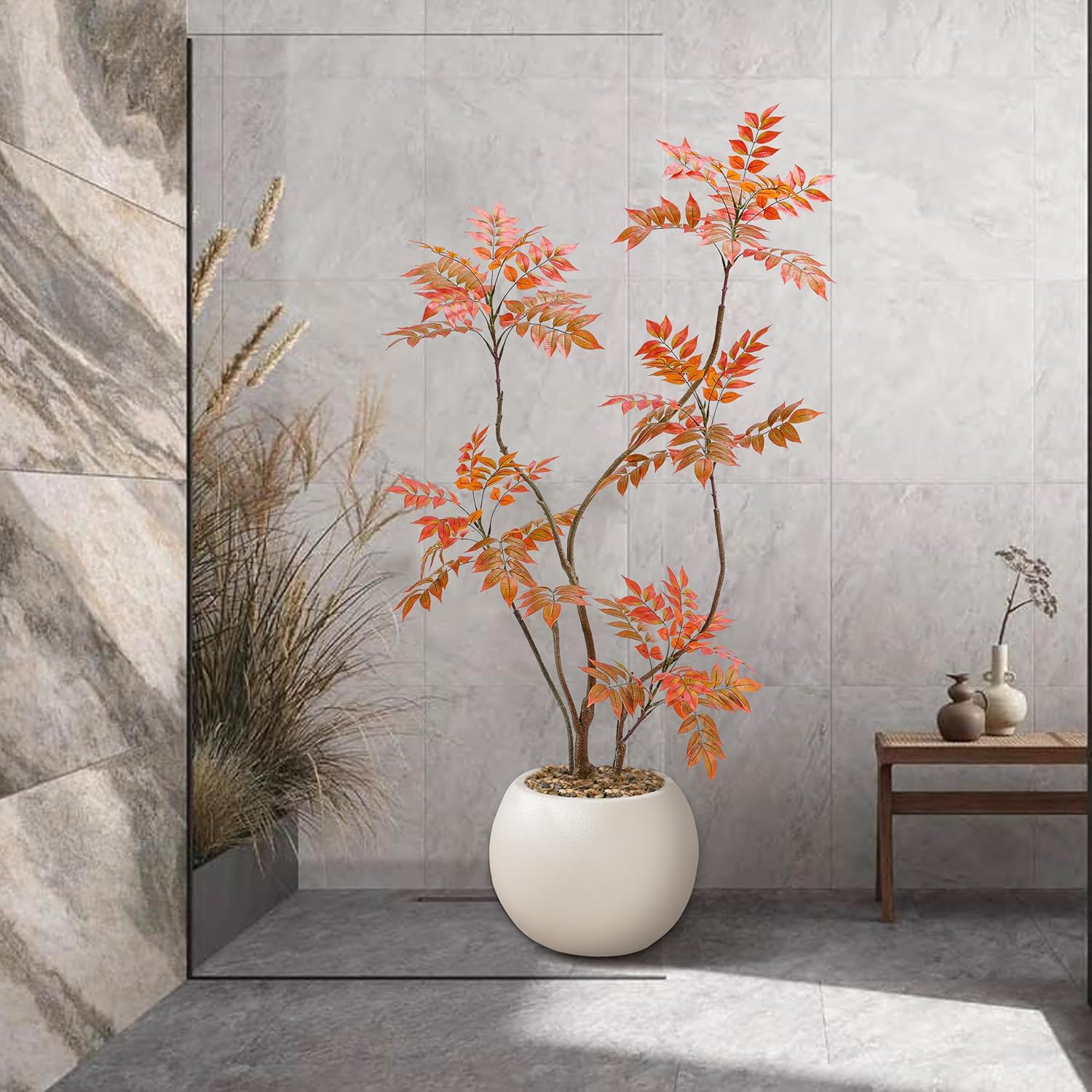 - Home Decor Accents: This 5ft/60in tall faux sumac tree contains 500 pieces real touch leaves who made of silk and each leaf has veins on it. Inclus a white planter(10"H x 10"W). The interior of the planter is made of sturdy concrete and the surface is decorated with non-falling coloured pebbles and the base use anti-tip tilt protection for greater stability