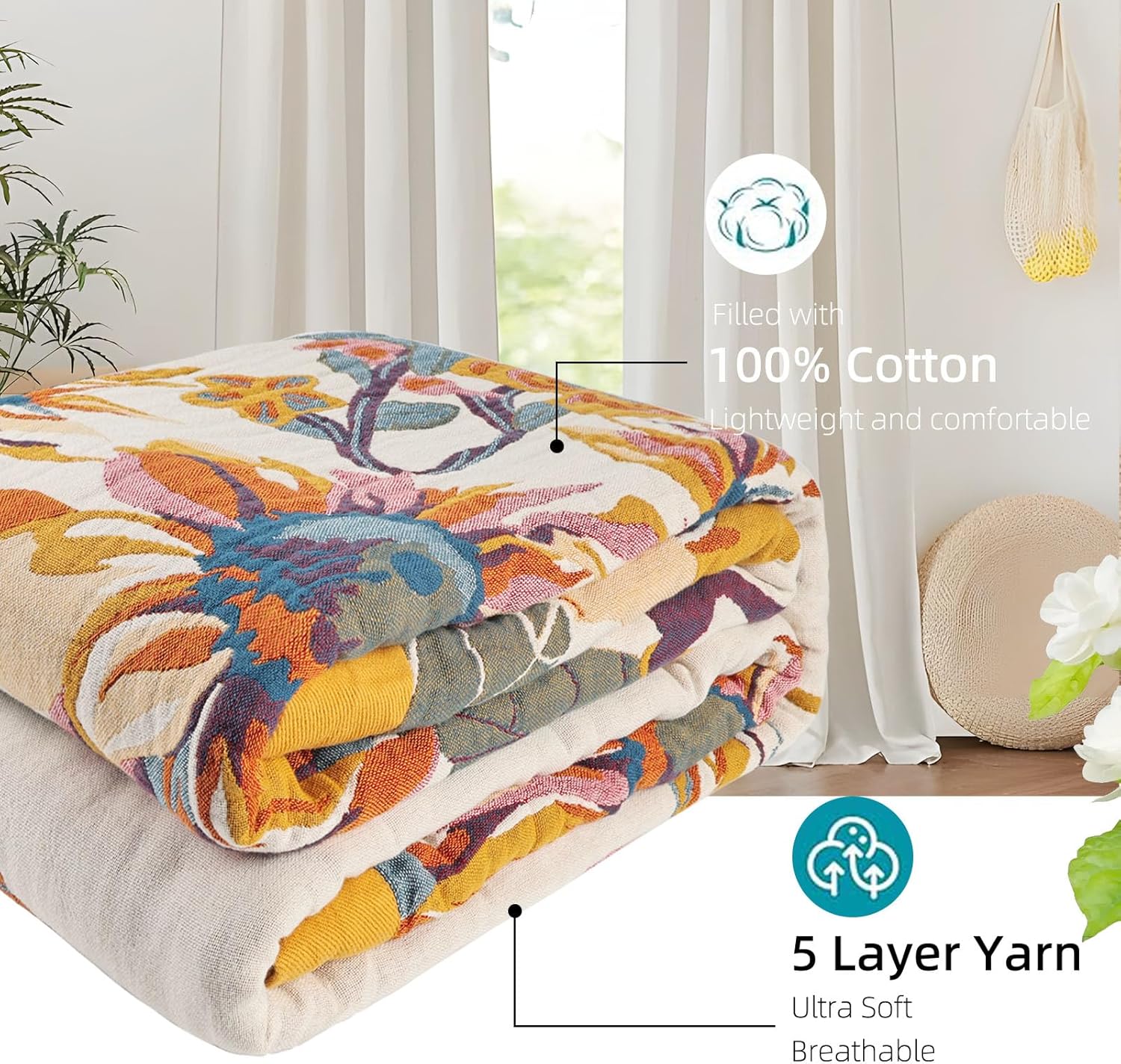 Boho Throw Blanket for Bed - 100% Pure Organic Cotton Ultra Soft Rustic Quilt - Farmhouse Decor Bed Blankets, All Season Rustic Throw for Sofa Couch Chair(91''x 98'', Floral)
