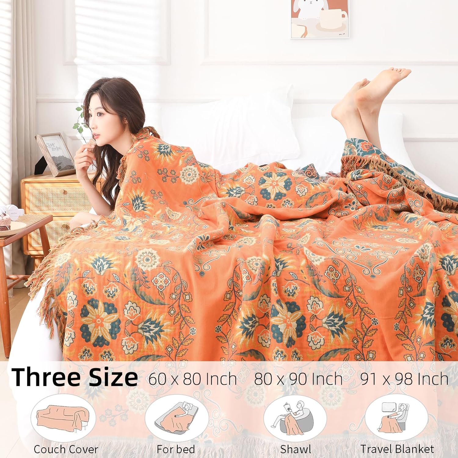 - ❥ super soft & cozy: Our bed blankets are made of 100% premium cotton fabric, warm and cozy to the touch. Sizes are available in 60" x 80" (weighing 2.54 lbs/1165 g), 80" x 90" (weighing 3.74 lbs/1696 g), 91" x 98" (weighing 5.29 lbs/2400 g). This beautiful cotton blanket is perfect for all seasons.