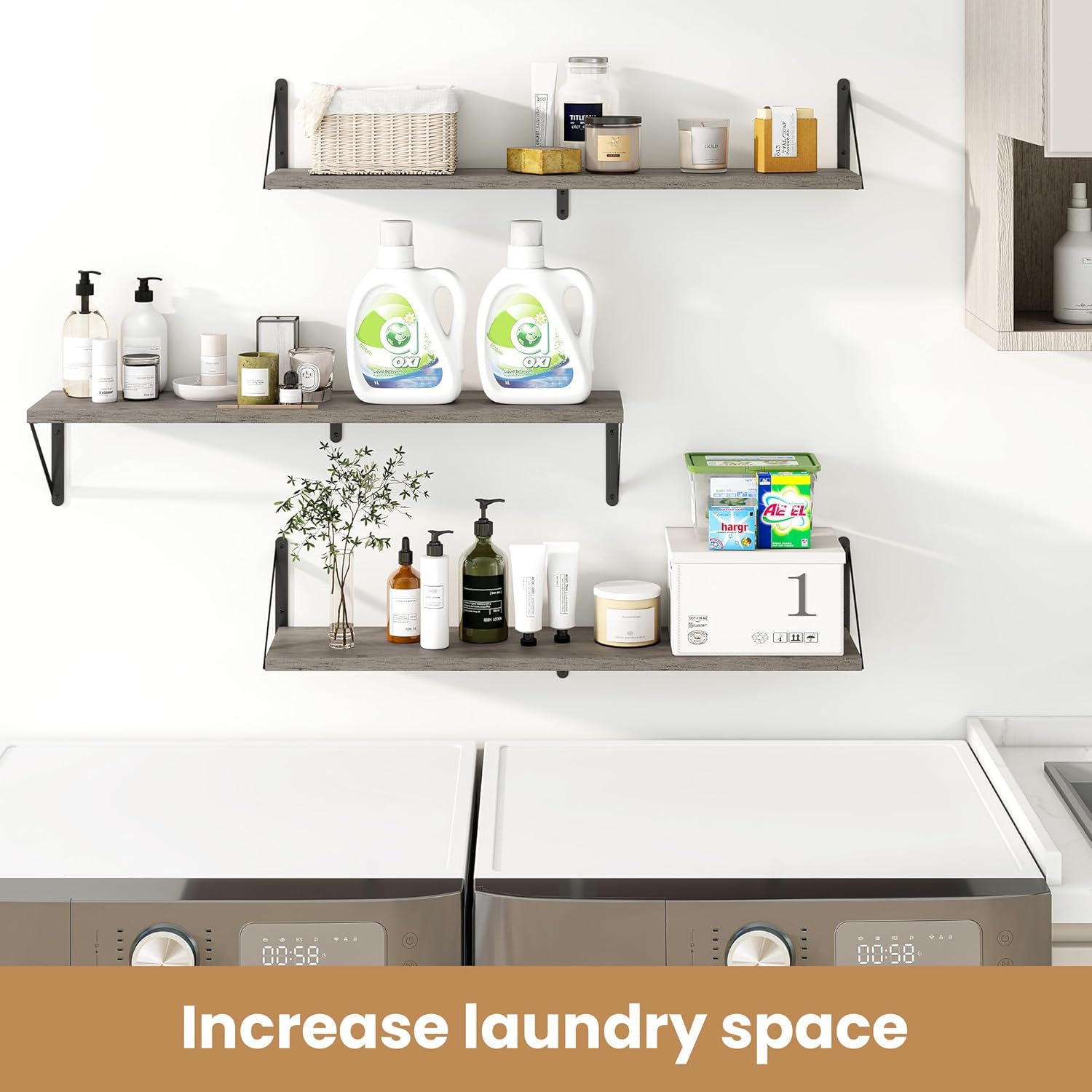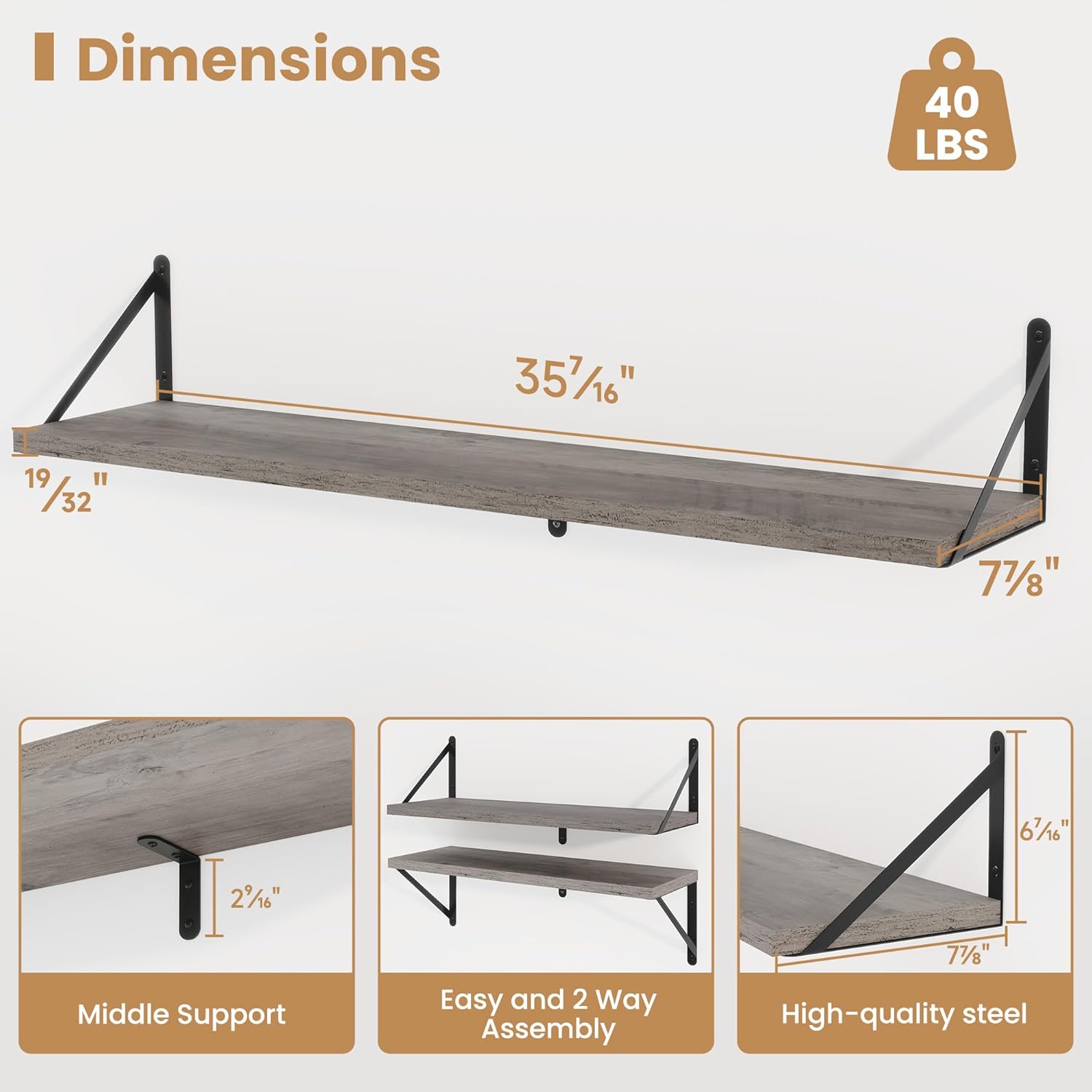 - ăSturdy and DurableăThe wall-mounted shelves are sturdy enough,with a load-bearing metal frame added in the middle,which will not deform and can withstand a weight of 40 pounds. It is very suitable for use as a wide bookshelf,TV stand,for home office,laundry room. Follow the instruction steps,including all necessary hardware,easy to assemble.