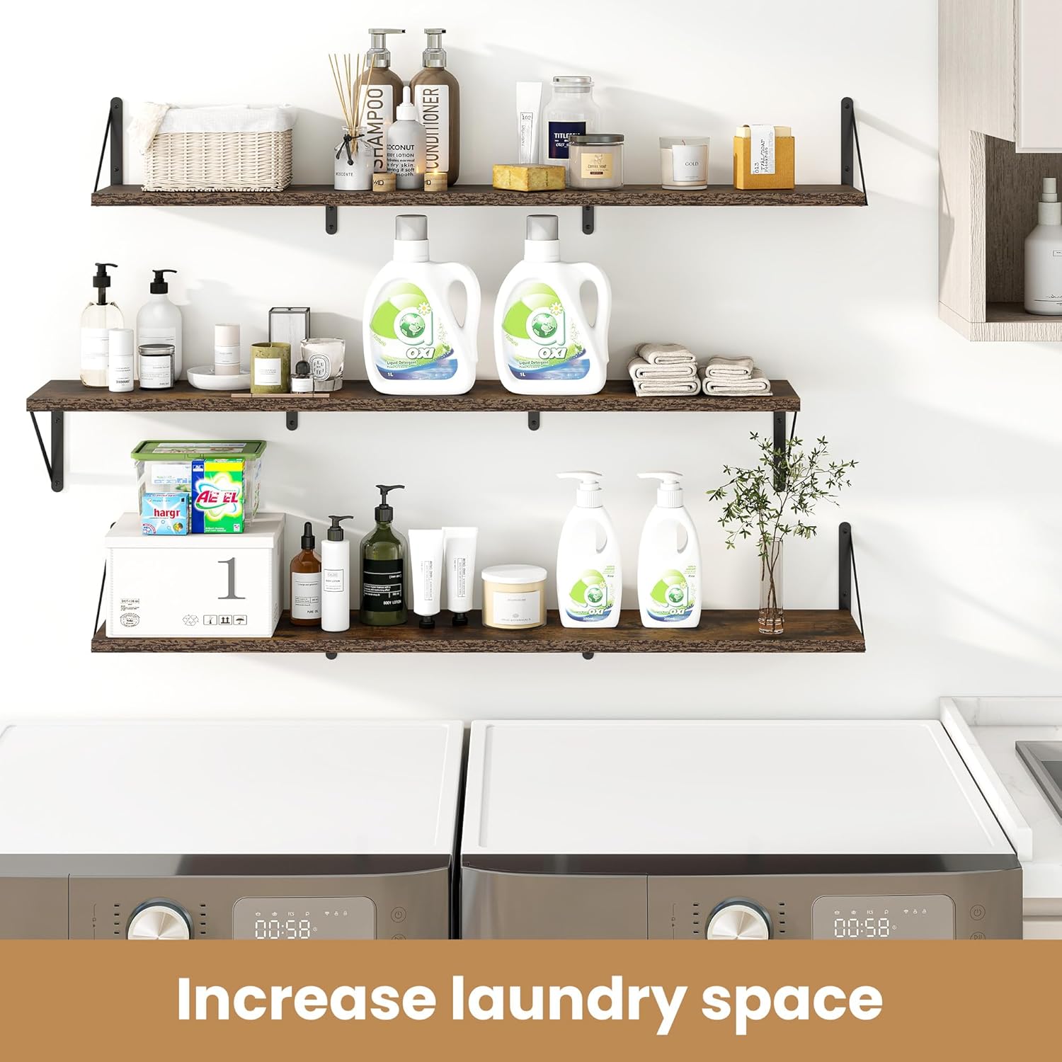 - ăSturdy and DurableăThe wall-mounted shelves are sturdy enough,with two load-bearing metal frame added in the middle,which will not deform and can withstand a weight of 50 pounds. It is very suitable for use as a wide bookshelf,TV stand,for home office,laundry room. Follow the instruction steps,including all necessary hardware,easy to assemble.