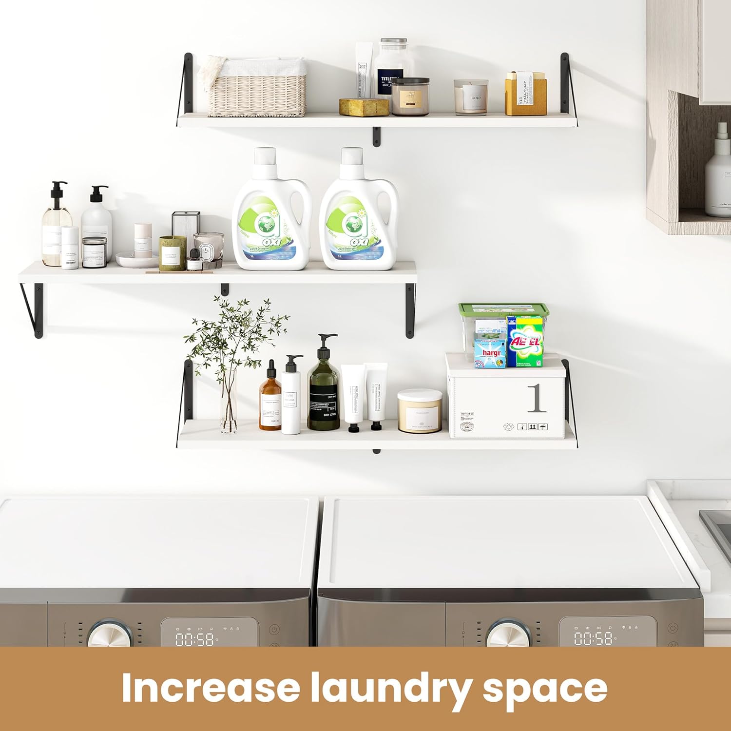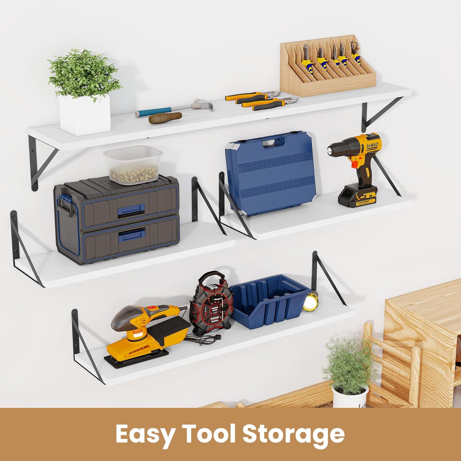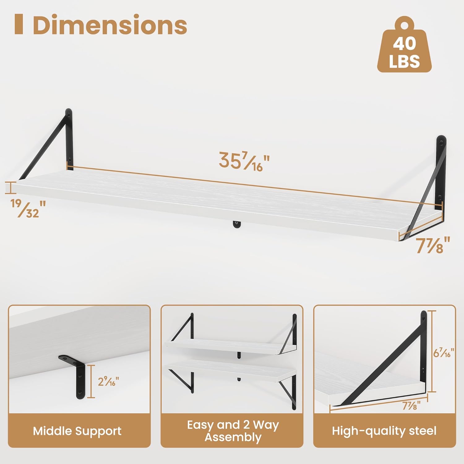 - ăSturdy and DurableăThe wall-mounted shelves are sturdy enough,with a load-bearing metal frame added in the middle,which will not deform and can withstand a weight of 40 pounds. It is very suitable for use as a wide bookshelf,TV stand,for home office,laundry room. Follow the instruction steps,including all necessary hardware,easy to assemble.